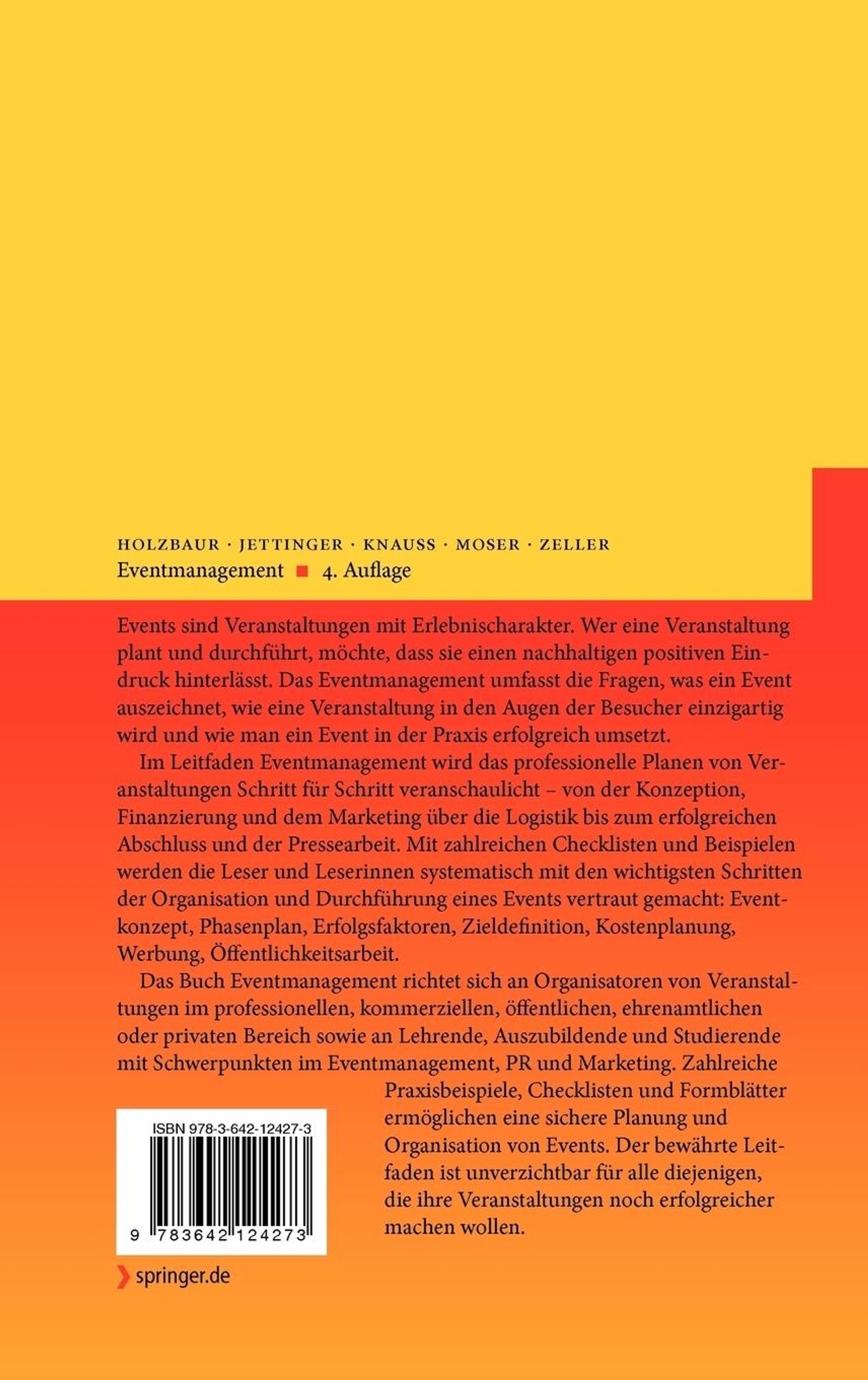 Events sind Veranstaltungen mit Erlebnischarakter. Zum Eventmanagement gehört die Frage, was ein Event auszeichnet, wie man eine Veranstaltung in den Augen der Besucher einzigartig macht und wie man ein solches Event in der Praxis umsetzt. Das Buch führt in die Grundlagen des Eventmanagements mit seinen Aufgabengebieten von der strategischen Planung bis zur operativen Durchführung und Steuerung ein. Ausgearbeitete Beispiele aus der Praxis sowie Checklisten und Formblätter ermöglichen eine sichere Planung und Organisation. Die Autoren haben vielfältige Erfahrungen mit Projekt- und Veranstaltungsmanagement, Eventmanagement und Eventmarketing aus verschiedenen beruflichen Bereichen zusammengetragen und einen Leitfaden für alle erstellt, die ihre Veranstaltungen (noch) erfolgreicher machen wollen.