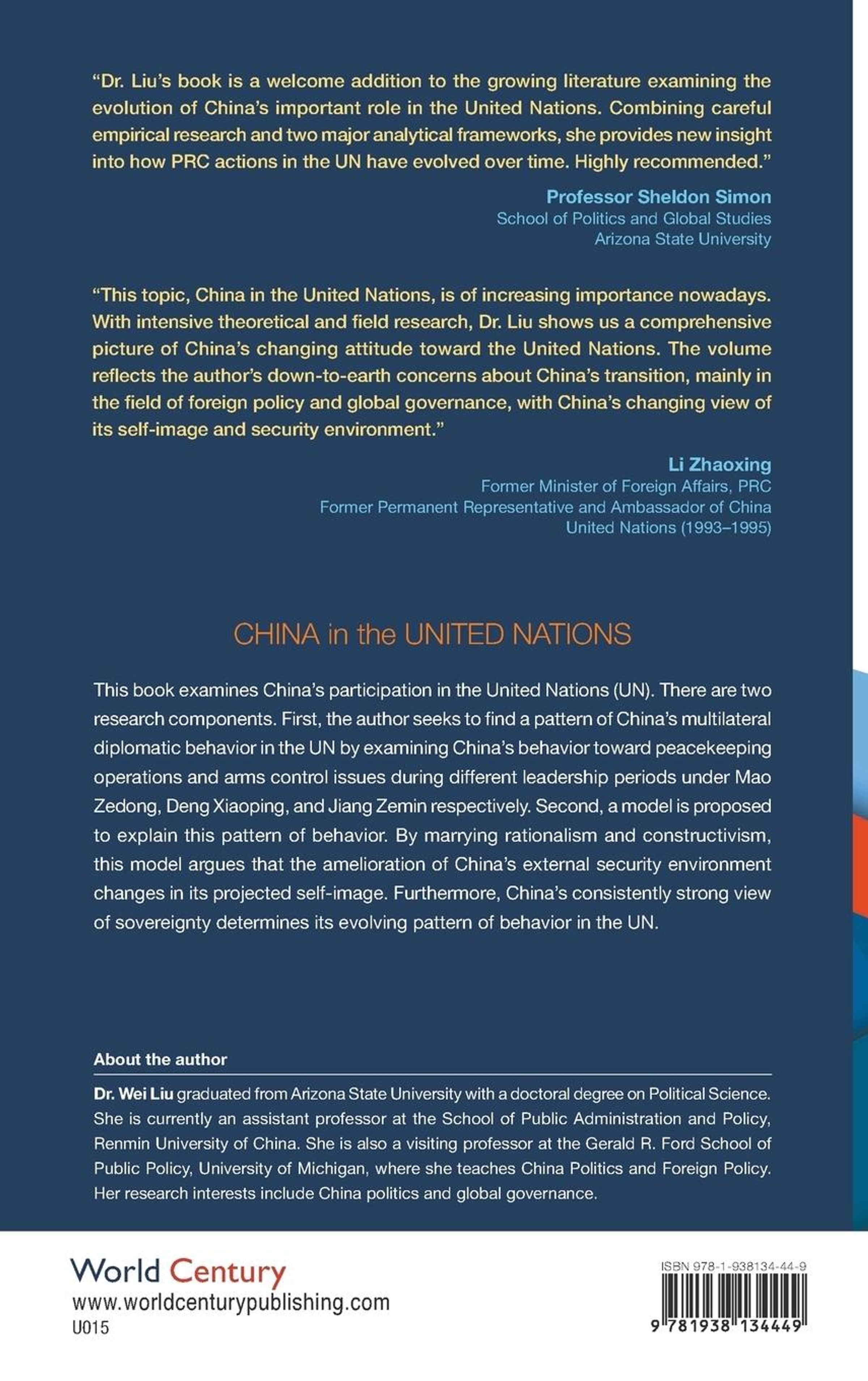 China in the United Nations examines China's participation in the United Nations (UN). There are two research components. First, the author seeks to find a pattern of China's multilateral diplomatic behavior in the UN by examining China's behavior towards peacekeeping operations and arms control issues during different leadership periods under Mao Zedong, Deng Xiaoping, and Jiang Zemin respectively. Second, a model is proposed to explain this pattern of behavior. By marrying rationalism and constructivism, this model argues that the amelioration of China's external security environment changes in its projected self-image. Furthermore, China's consistently strong view of sovereignty determines its evolving pattern of behavior in the UN.