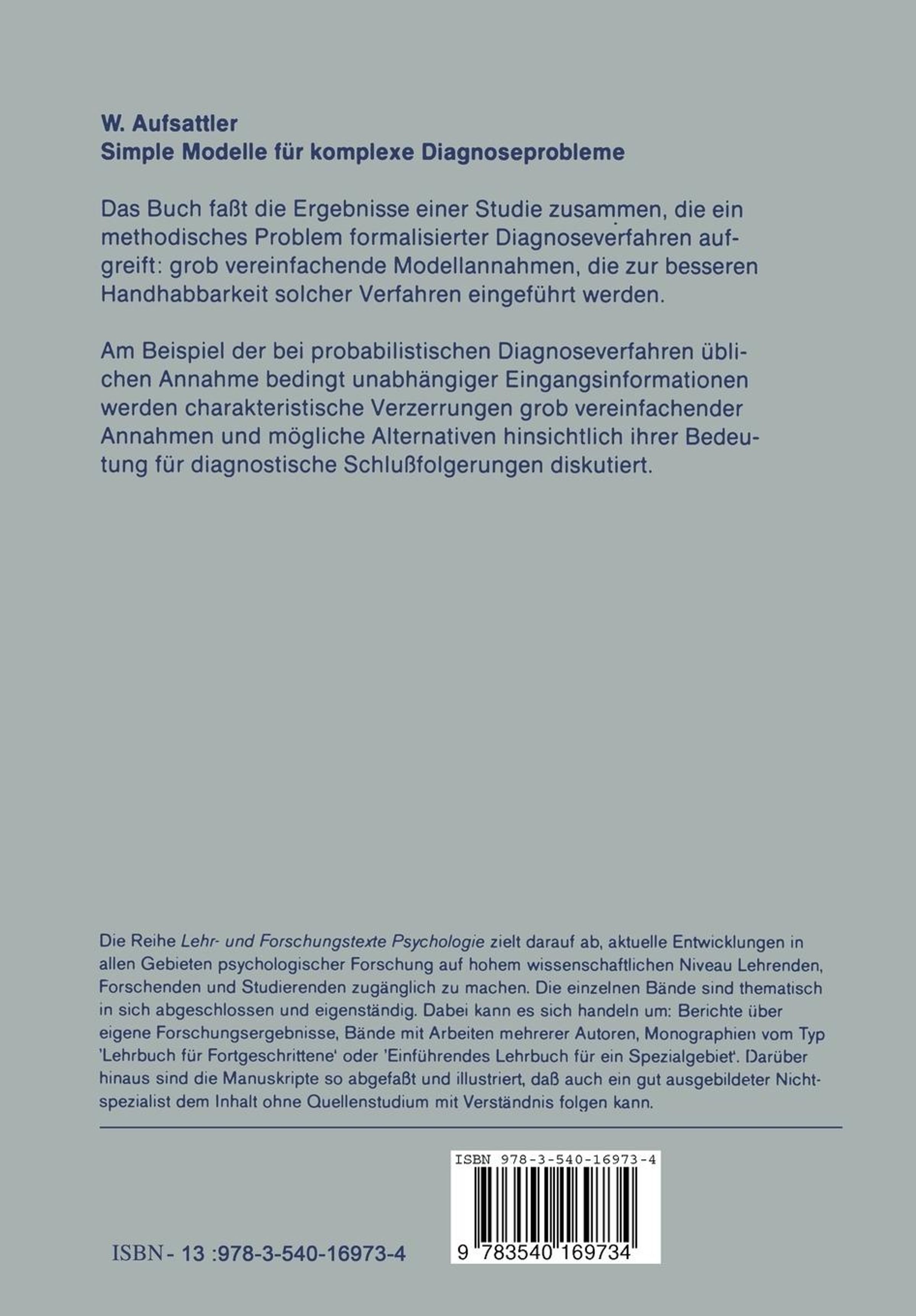 1. Einleitung.- 2. Simple Modelle für komplexe Probleme ?.- 2.1. Zur Notwendigkeit formaler Entscheidungshilfen.- 2.2. Zur Notwendigkeit vereinfachender Modellannahmen bei formalen Entscheidungshilfeverfahren.- 2.3. Formale Diagnose über das Bayes Theorem und bedingte Unabhängigkeit.- 3. Bisherige Untersuchungen zum Problem bedingte Unabhängigkeit.- 4. Alternative ModelLannahmen, Möglichkeiten ihrer Fotmalisierung und Schätzverfahren.- 4.1. Welche Alternativen kommen in Betracht ?.- 4.2. Parametrische Modelle für mehrdimensionale Kontingenztafeln und Schätzverfahren.- 5. Methodische Probleme.- 5.1. Bewertungskriterien für probabi1istische Diagnoseverfahren.- 5.2. Modellfehler und Stichprobenfehler.- 5.3. Zur Grobdifferenzierung von Datenstrukturen.- 6. Ablauf der Untersuchung.- 6.1. Programmentwicklung.- 6.2. Auswahl der Datensätze und Zusammenstellung der Analyseeinheiten.- 6.3. Auswertungsphase.- 7. Ergebnisse.- 7.1. Beschreibung der Datensätze.- 7.2. Übersicht über die Grobstruktur der verwendeten Datensätze.- 7.3. Vergleich der Schätzfehler bei der Annahme bedingt unabhängiger Indikatoren und der Annahme paarweise interkorrelierter Indikatoren.- 7.4. Modellfehler und Stichprobenfehler.- 7.5. C1uster-Modelle.- 8. Zusammenfassung und Diskussion.- 8.1. Gegenstand und Zielsetzung der Arbeit.- 8.2. Zusammenfassung der Ergebnisse.- 8.2.1. Zur Robustheit des Bayes Theorems gegenüber Verletzungen der bedingten Unabhängigkeit.- 8.2.2. Es gibt brauchbare Alternativen.- 8.2.3. Modellfehler und Stichprobenfehler.- 8.3. Schlußfolgerungen.- Anhang A Übersicht über die Prozentsätze übet- und unterkonfidenter Schätzungen bei den einzelnen Analyseeinheiten der drei Datensätze.- Anhang B Tabellen des Wahl-Datensatzes .