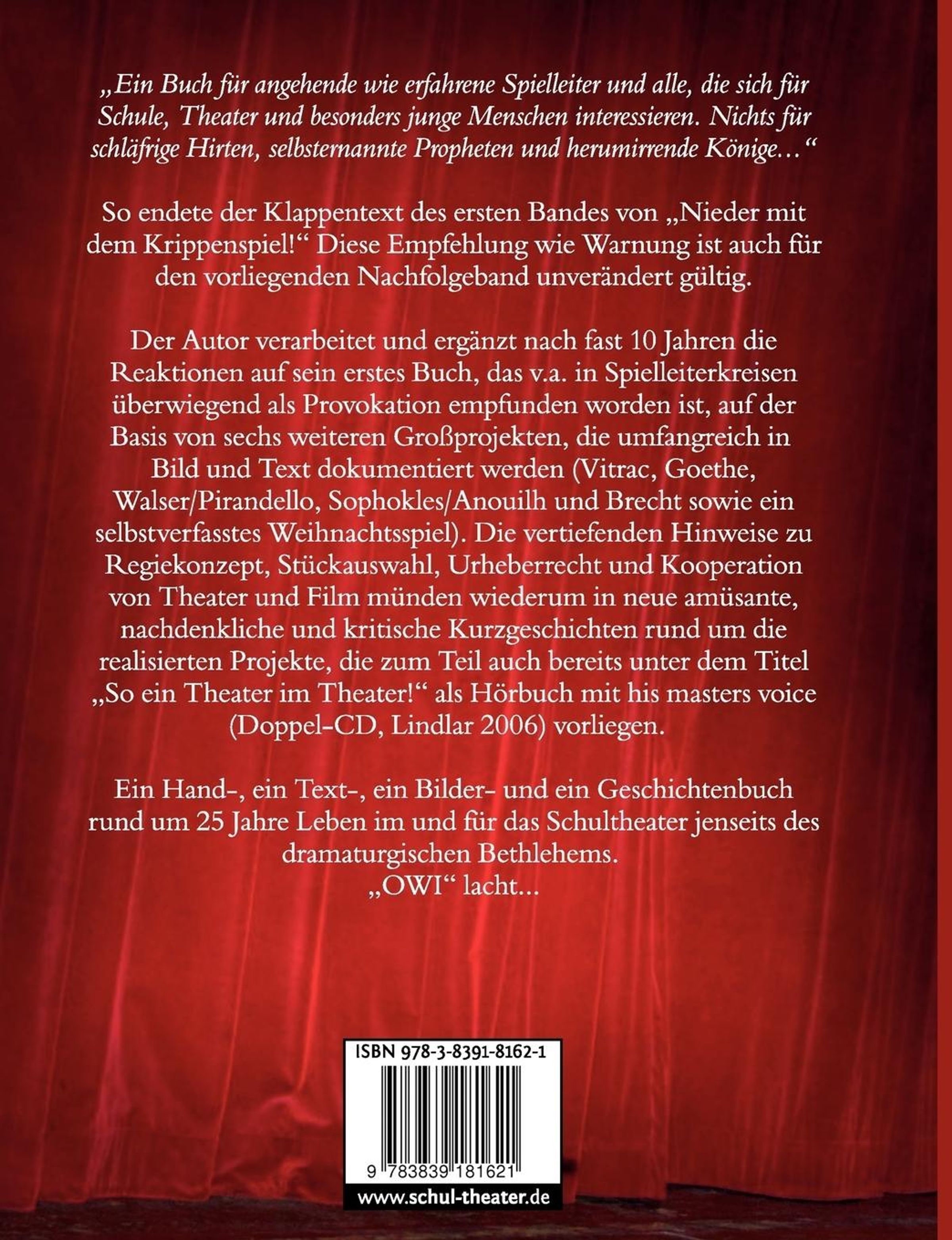 Der Autor kommentiert, dokumentiert und erzählt 6 weitere Theatergroßprojekte aus dem Schultheater (2001-2008) und vertieft dabei sein Credo aus dem ersten Band von 2000: Auch das Schultheater bedarf einer Pädagogik der Anstrengung, um semiprofessionellen Ansprüchen zu genügen und nicht in den Niederungen des unsäglichen Krippenspiels zu versinken.