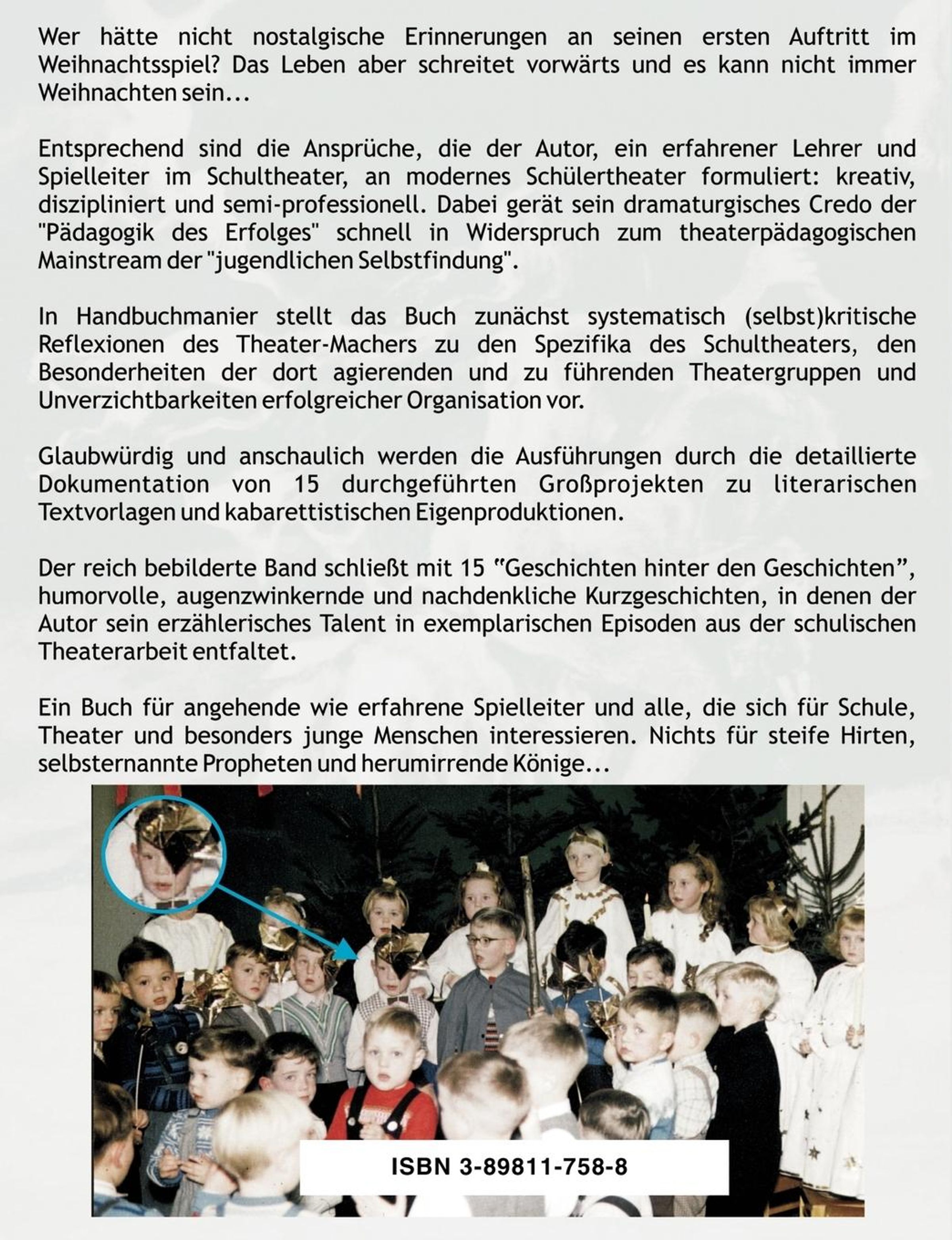 Das Buch formuliert die Erfahrungen eines Spielleiters an modernes Schultheater: kreativ, diszipliniert und semi-professionell muß es sein, um nicht zum Krippenspiel zu verkommen! In Handbuchmanier stellt das Buch systematisch (selbst)kritische Reflexionen des Theater-Machers zu den Spezifika des Schultheaters, der dort agierenden Gruppen und den Unverzichtbarkeiten erfolgreicher Organisation vor. Das dabei formulierte dramaturgische Credo der "Pädagogik des Erfolges" wird durch eine detaillierte Dokumentation von 15 Großprojekten untermauert und durch 15 exemplarische Kurzgeschichten veranschaulicht.