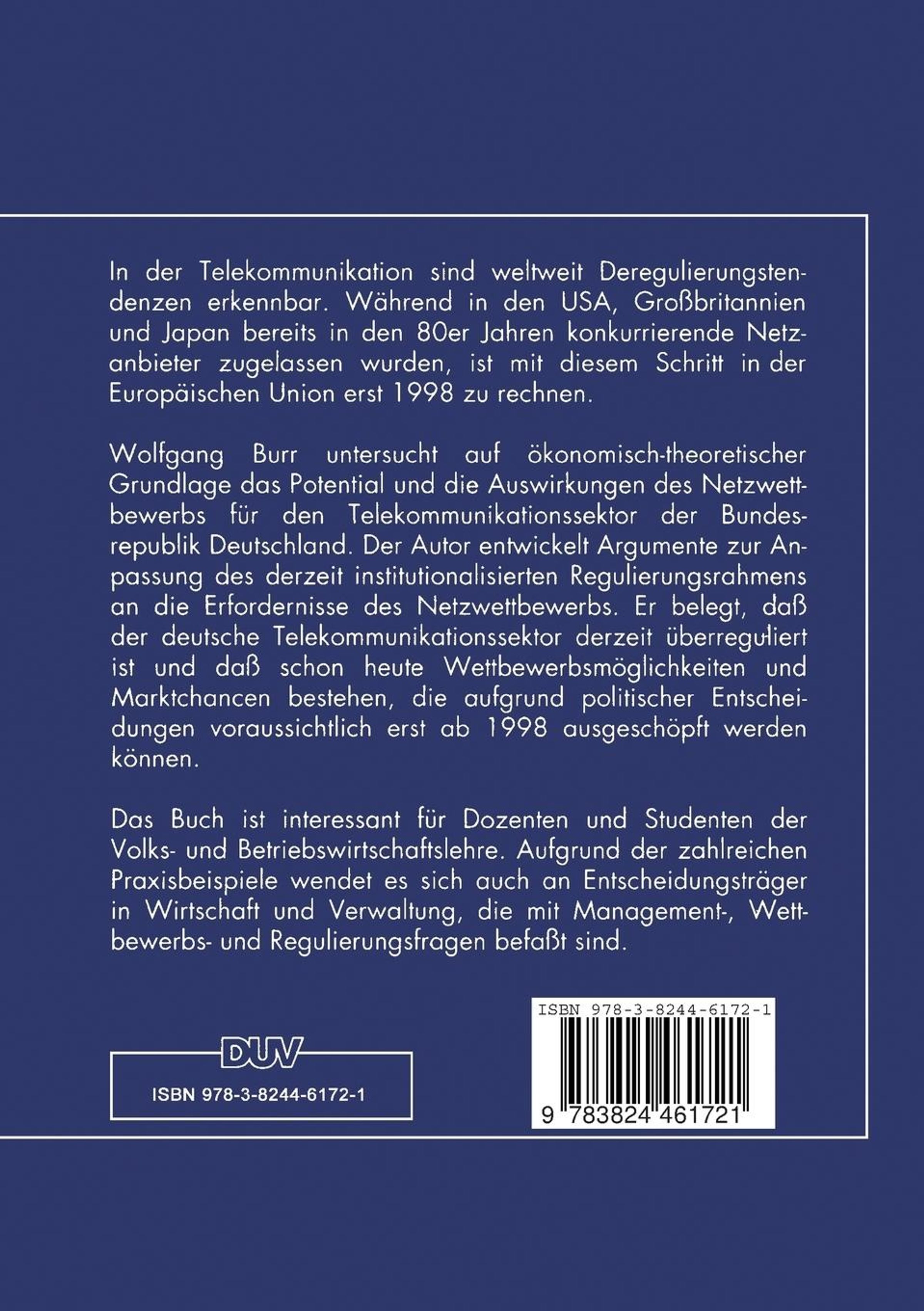 In der Telekommunikation sind weltweit Deregulierungstendenzen erkennbar. Wolfgang Burr untersucht auf ökonomisch-theoretischer Grundlage das Potential und die Auswirkungen des Netzwettbewerbs für den Telekommunikationssektor der Bundesrepublik Deutschland.