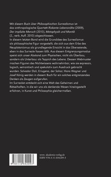 Mit diesem Buch über Philosophischen Surrealismus ist das anthropologische Quartett Riskante Lebensnähe (2009; engl. Risky Proximity to Life , 2010), Der implizite Mensch (2013), Metaphysik und Mantik(2., verb. Auflage 2013) abgeschlossen. In diesem letzten Band wird die Grundidee des Surrealismus als philosophische Figur vorgestellt, die sich aus dem Erbe des Neuplatonismus als grundlegende Einsicht in das Überseiende, eben in das Surreale fassen läßt. Aus diesem Entgrenzungsmodus speist sich unser Abstand zum Physischen, nicht als Überbau, sondern als Unterbau: als Teppich des Lebens. Dessen Webmuster machen Figuren des Nichtwissens wahrnehmbar, wie sie expressiv, logisch, semantisch und spekulativ zum Ausdruck gebracht wurden. Salvador Dali, Eriugena, der Sohar, Hans Wagner und Josef König werden in diesem Buch für ein solches entgrenzendes Denken als Zeugen aufgerufen. Im Surrealen entdeckt sich eine Welt des Geheimen und Rätselhaften, in die wir uns als denkende Wesen hineingestellt erfahren, in Kunst und Philosophie gleichermaßen.