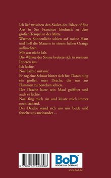 Ich lief zwischen den Säulen des Palace of fine Arts in San Francisco hindurch zu dem großen Tempel in der Mitte. Warmes Sonnenlicht schien auf meine Haut und ließ die Mauern in einem hellen Orange aufleuchten. Mir war nicht kalt. Die Wärme der Sonne breitete sich in meinem Inneren aus. Ich lachte. Noél lachte mit mir. Er zog eine Schnur hinter sich her. Daran hing ein großer, roter Drache, der nur aus Flammen zu bestehen schien. Der Drache hatte sein Maul geöffnet und auch er lachte. Noél fing mich ein und küsste mich immer noch lachend. Der Drache wand sich um uns beide und fesselte uns aneinander ...