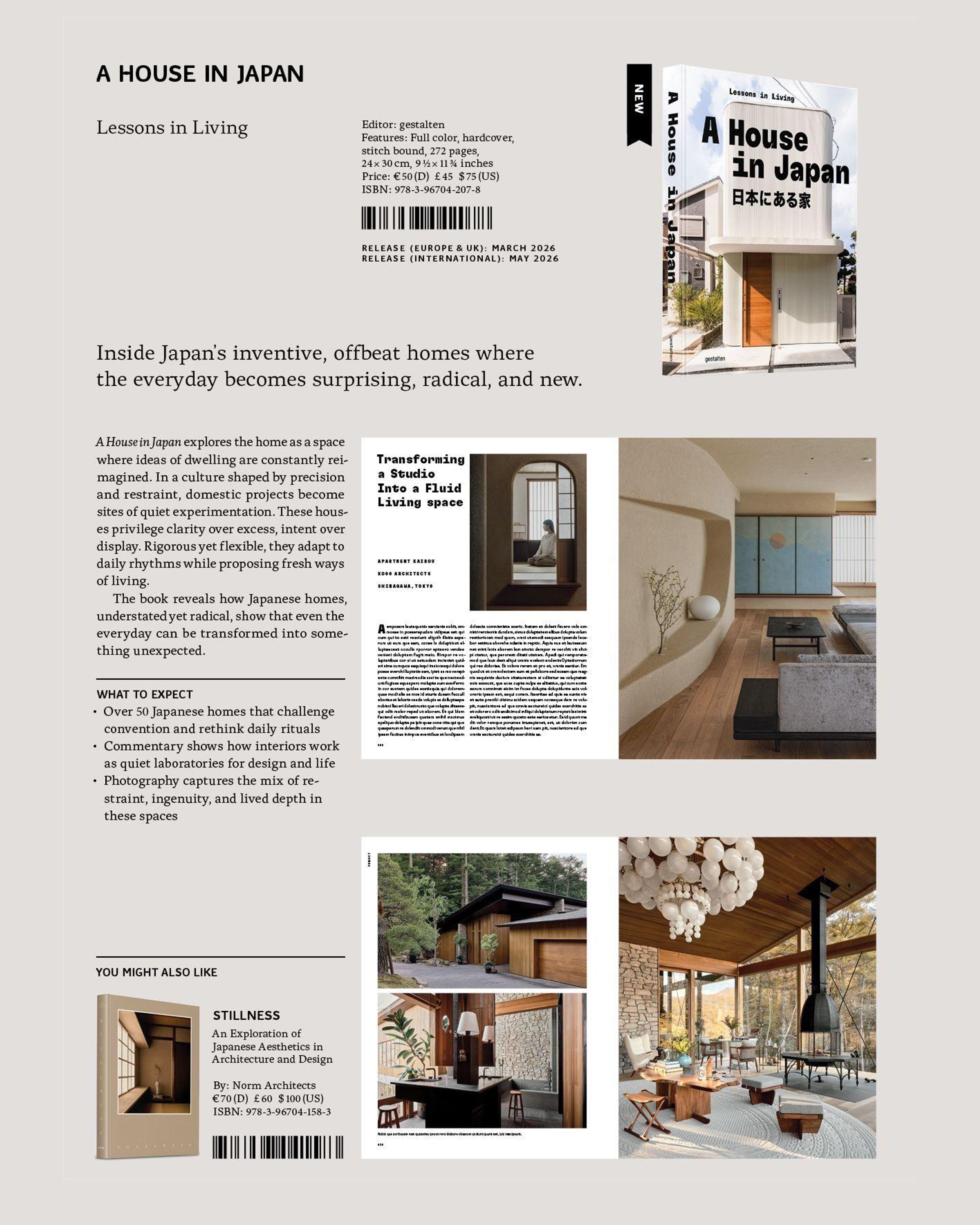 A House in Japan erkundet das japanische Zuhause als einen Ort, an dem Vorstellungen vom Wohnen immer wieder hinterfragt und neu definiert werden. In einer von Präzision und Zurückhaltung geprägten Kultur werden Wohnhäuser zu Orten stiller Experimente. Sie setzen auf Klarheit statt Überfluss, auf Haltung statt Zurschaustellung. Streng und zugleich flexibel passen sie sich den Rhythmen des Alltags an und eröffnen neue Möglichkeiten des Lebens. Das Buch zeigt, wie japanische Häuser selbst das Alltägliche in etwas Unerwartetes verwandeln können.