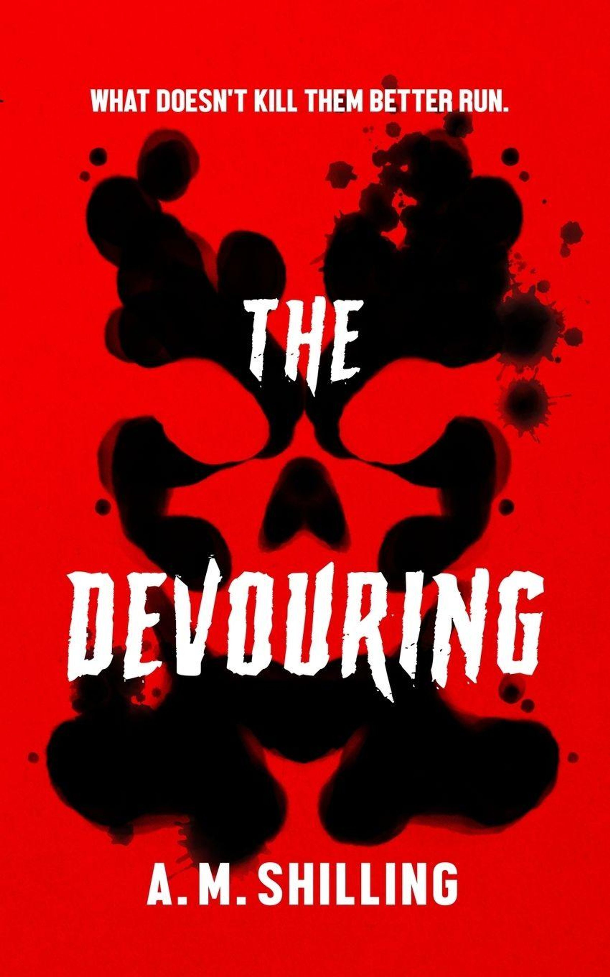 Text: "What doesn't kill them better run. The Devouring. A.M. Shilling." Schwarze Tintenkleckse auf rotem Hintergrund., Buch