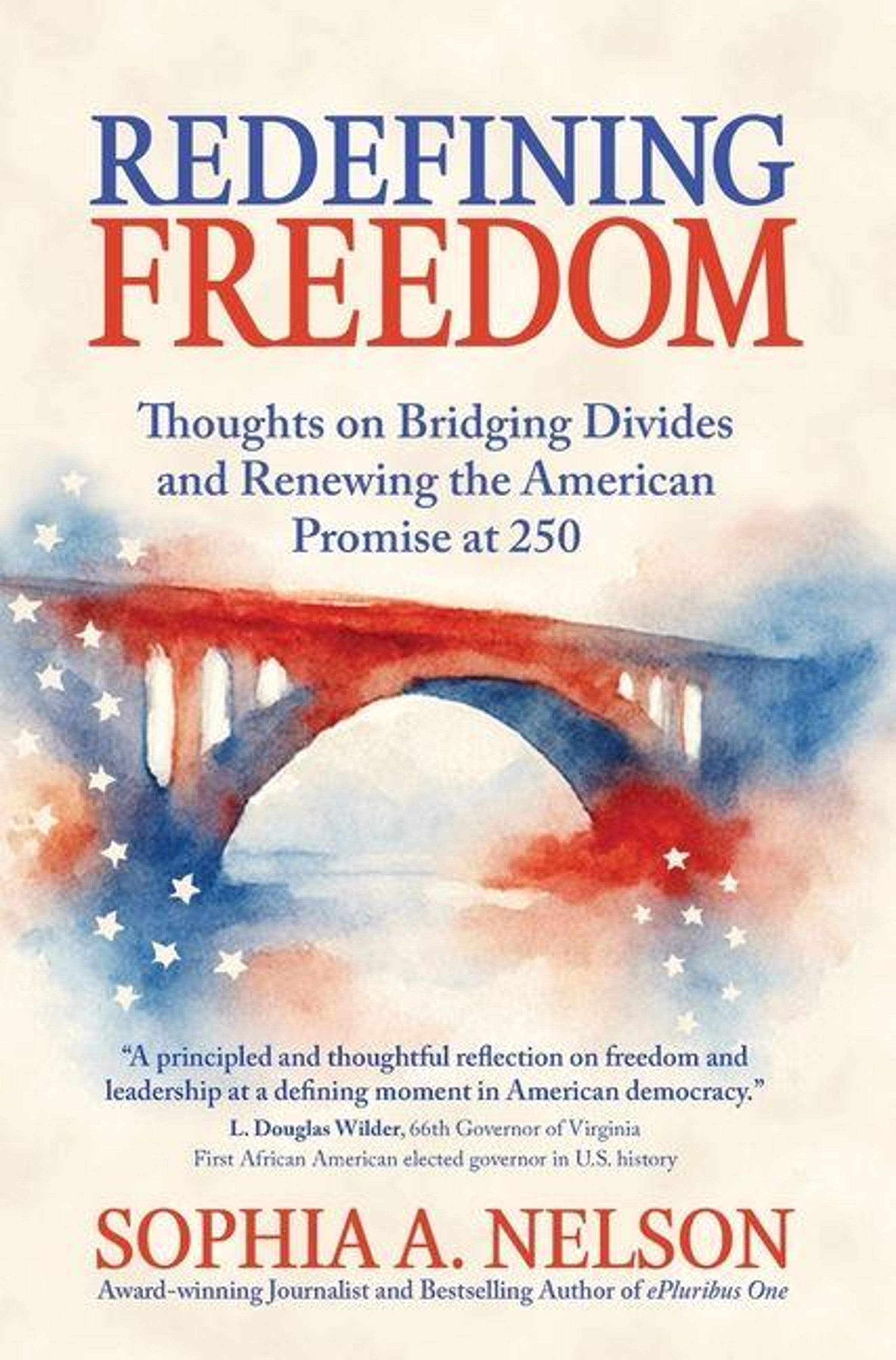 "REDEFINING FREEDOM" oben, Zitat von L. Douglas Wilder unten, Aquarell-Brücke und Sterne in Blau und Rot., Buch