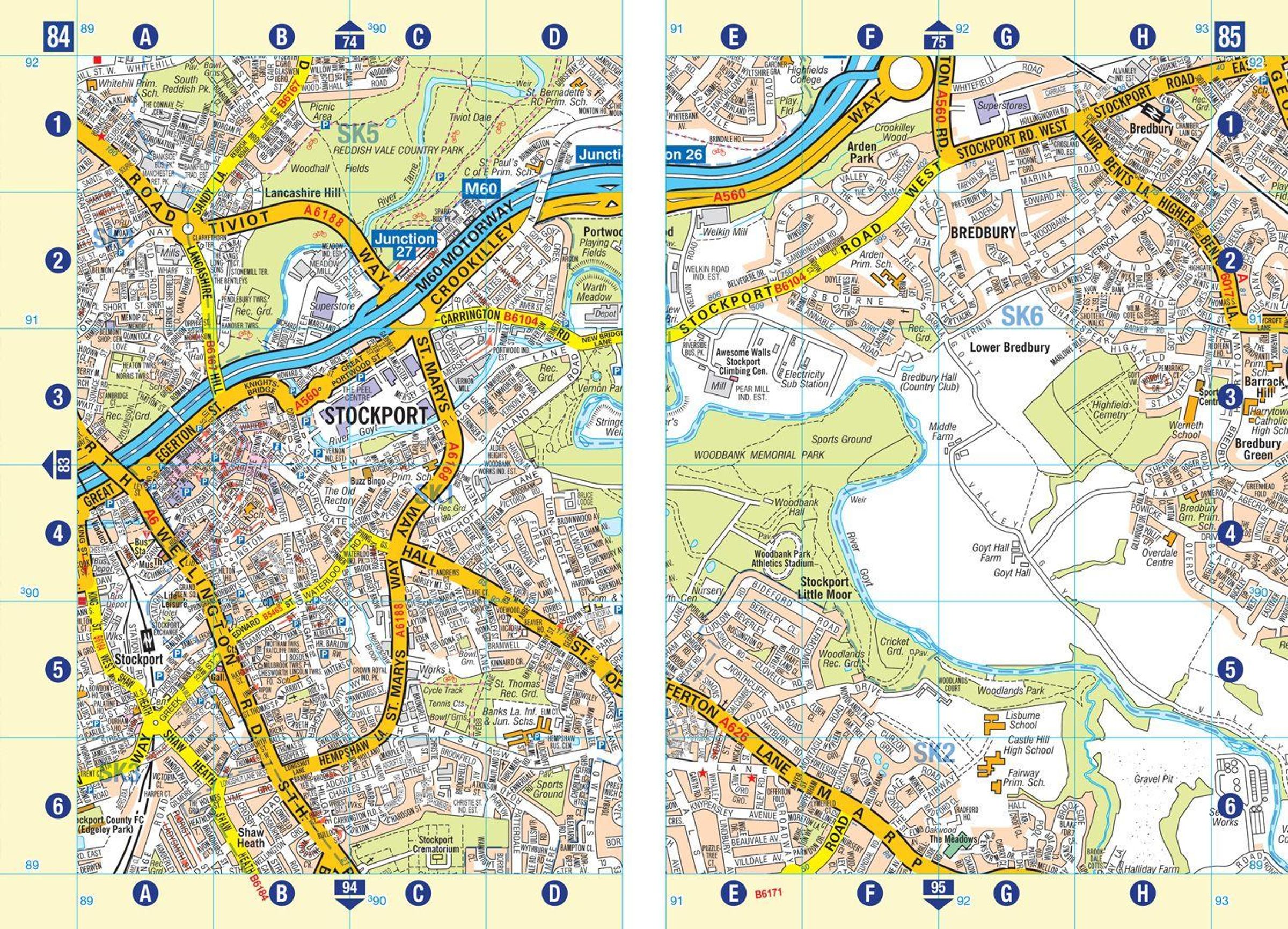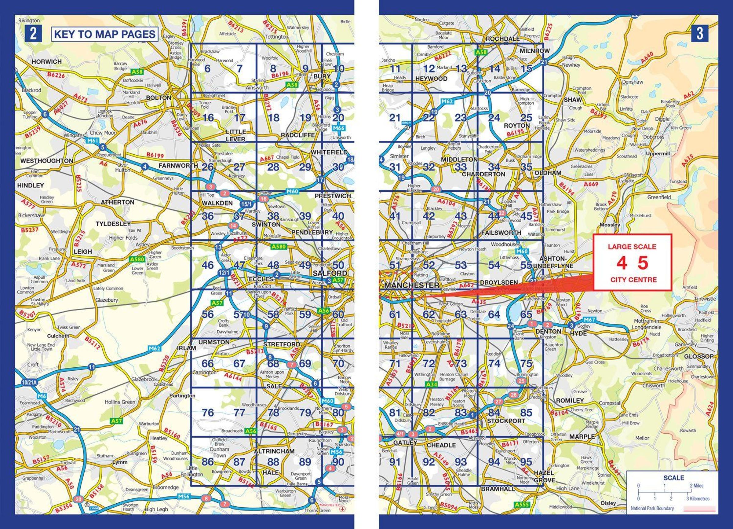 There is separate coverage of Knutsford and large scale city and town centre maps of: Manchester, Altrincham, Ashton-under-Lyne, Bolton, Bury, Oldham, Rochdale, Stockport, Wigan.