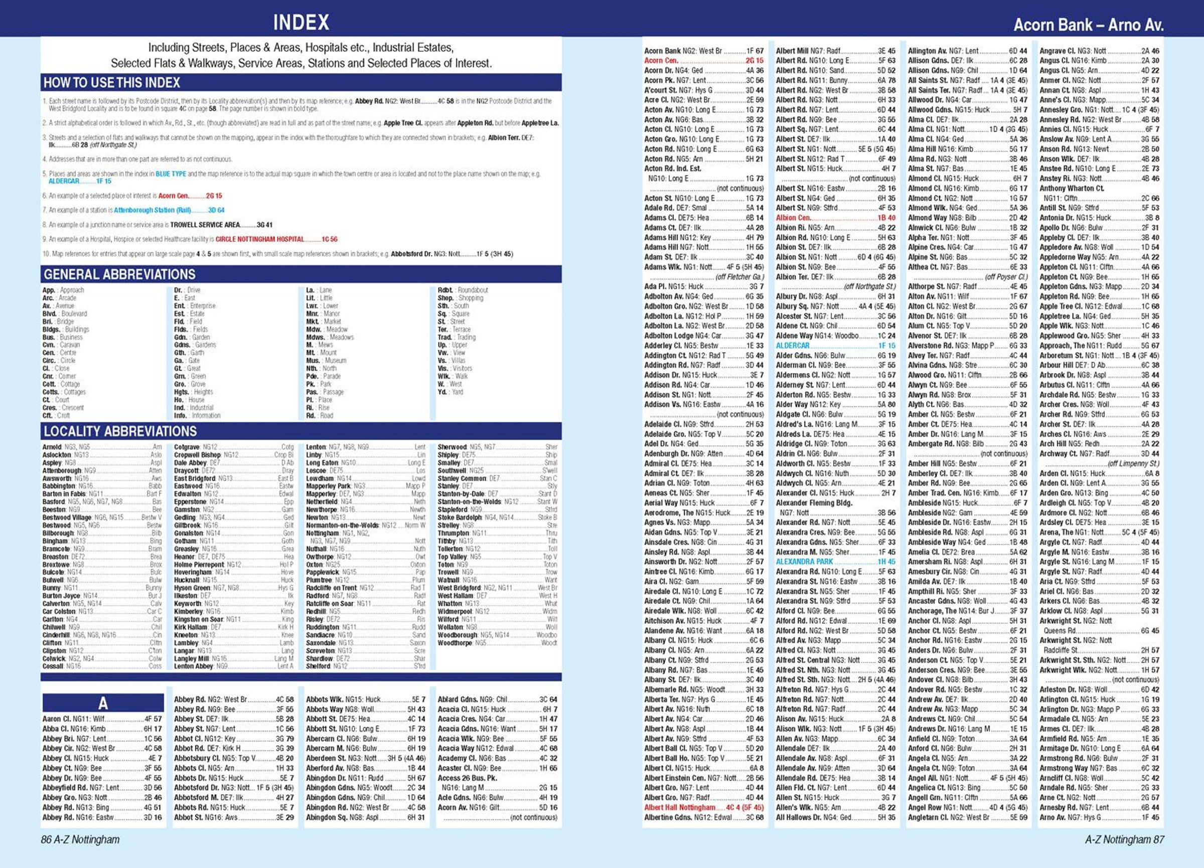A comprehensive index lists streets, selected flats, walkways and places of interest, place, area and station names. Additional healthcare (hospitals, walk-in centres and hospices) and transport connections (Nottingham Express Transit) are indexed as well.