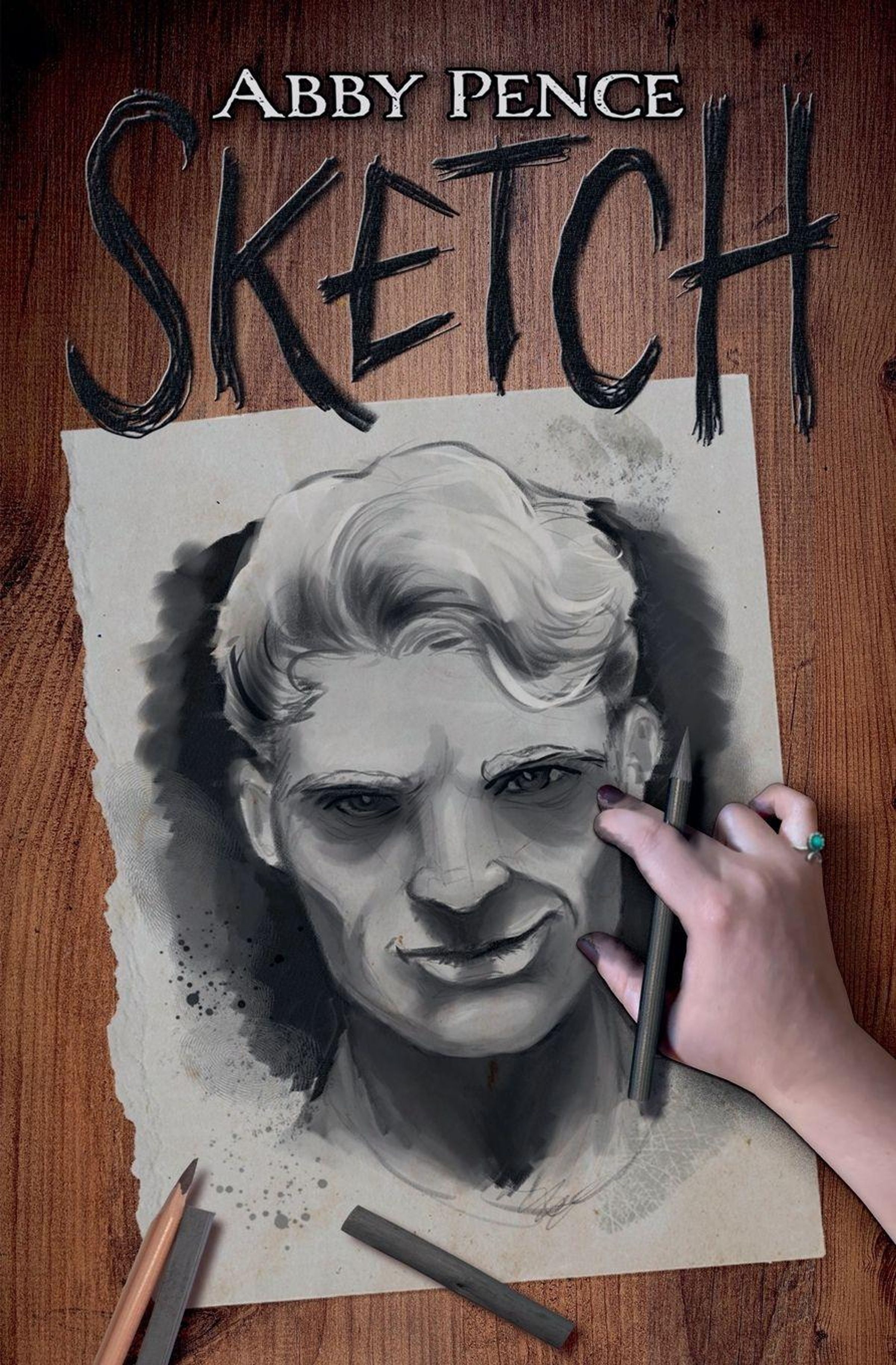 Der Text "Abby Pence Sketch" steht oben. Eine Hand zeichnet mit Stift ein Porträt auf Papier., Buch