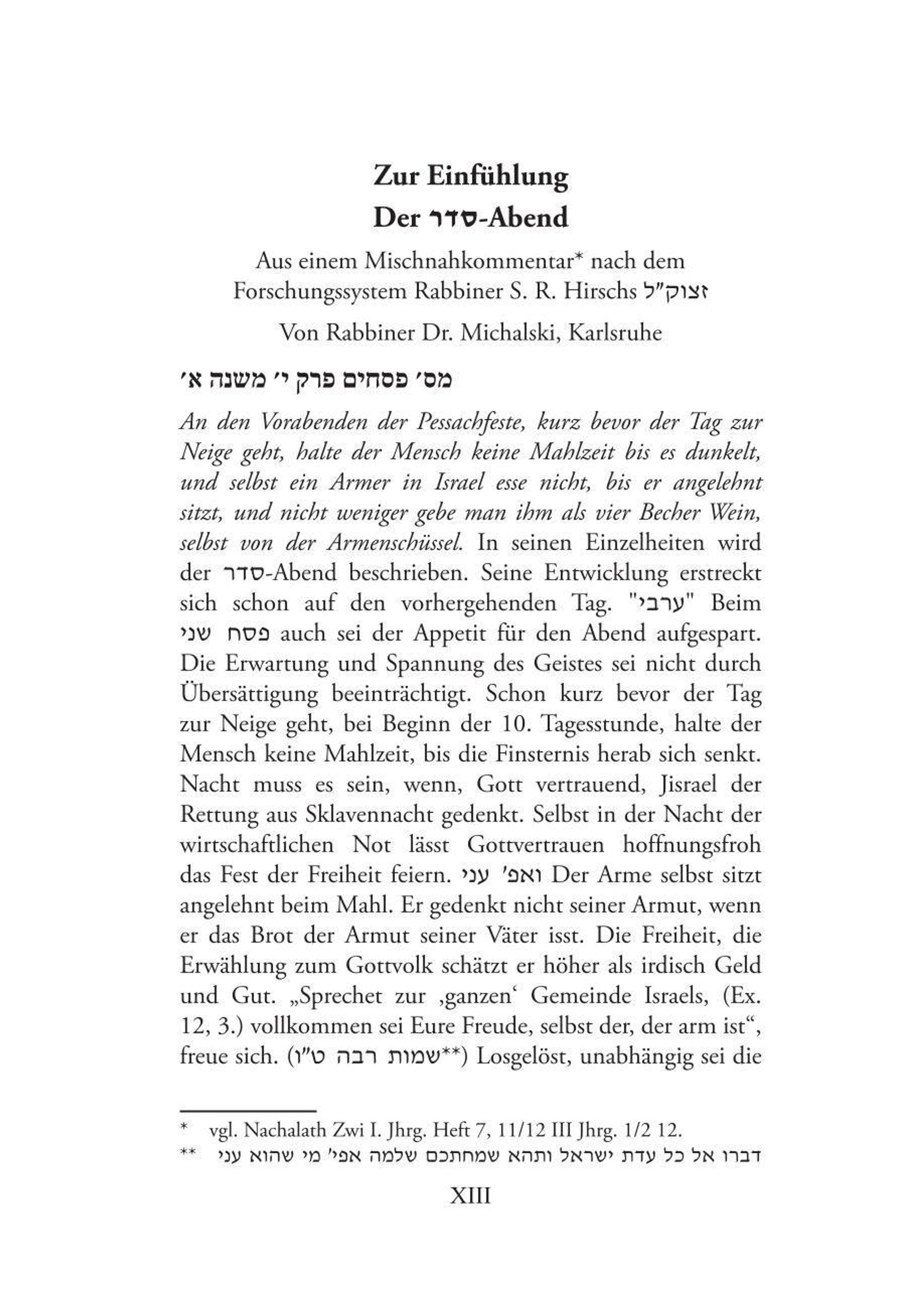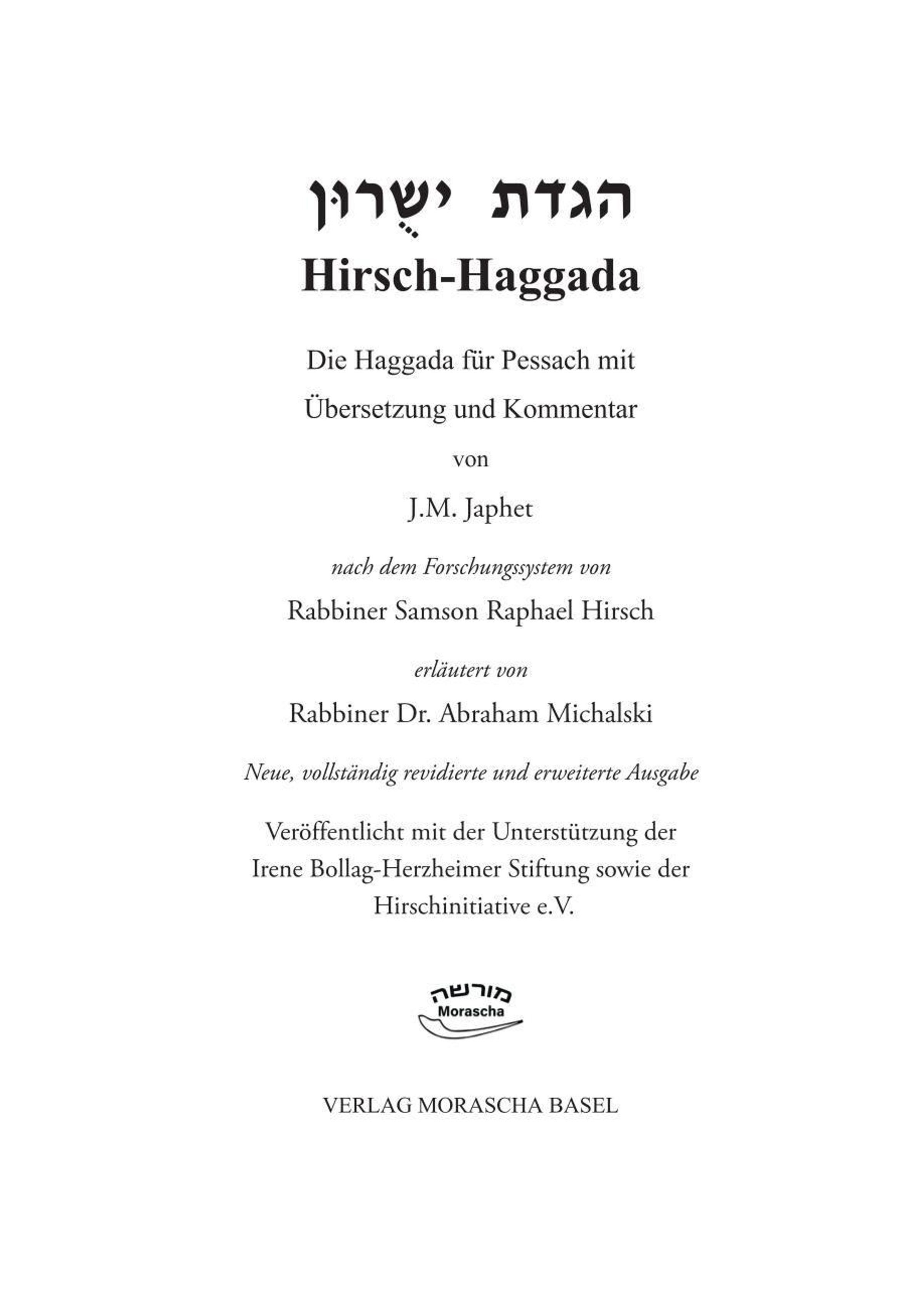 Mit der Hirsch-Haggada begann der Verlag Morascha die Herausgabe der Werke des grossen Meisters Samson Raphael Hirsch. Die Haggada ist im religiösen Leben der Juden und Handlungsanweisung für den Seder. Dies ist die Zeremonie zu Beginn des jüdischen Pessach Festes, der Befreiung der Juden aus der ägyptischen Sklaverei.