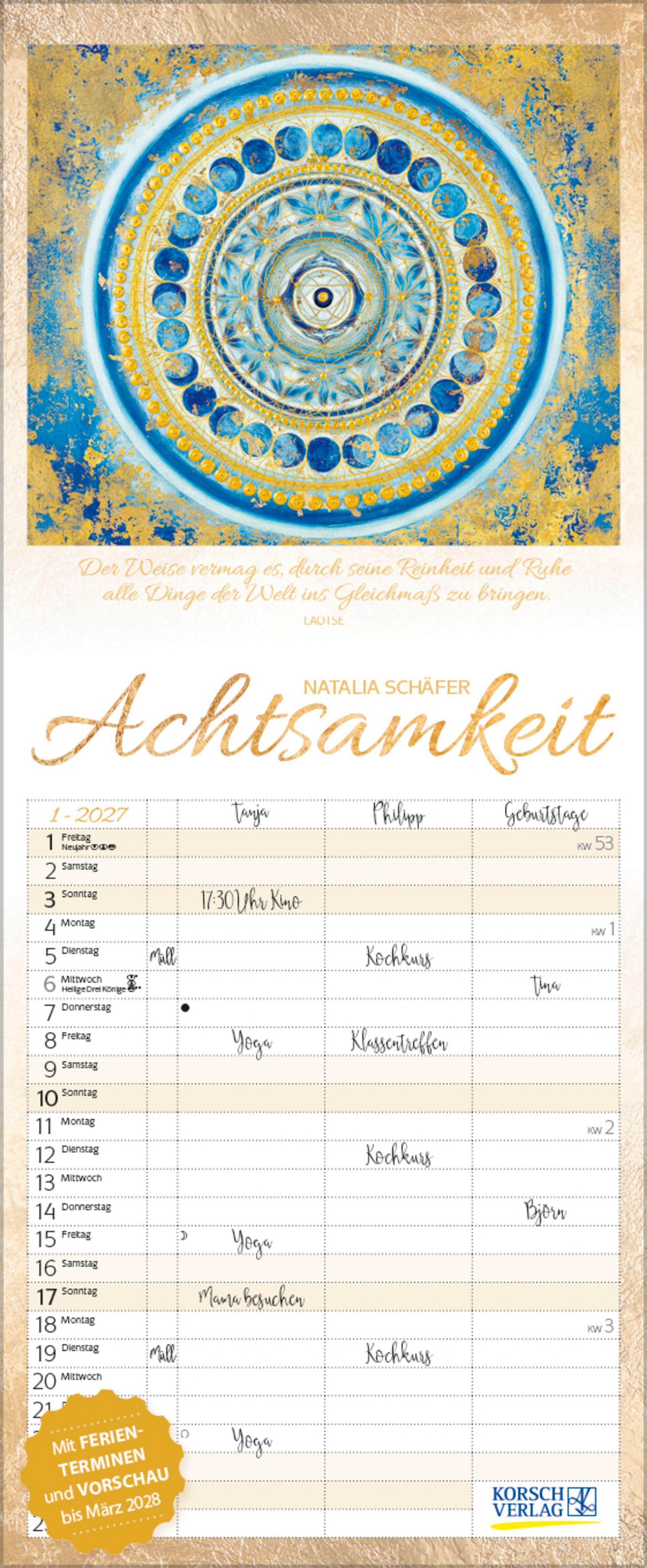 - Familienplaner mit 3 breiten Spalten. Familienkalender zum Thema Achtsamkeit, mit Ferienterminen, Vorschau bis März 2027 und vielem mehr.
