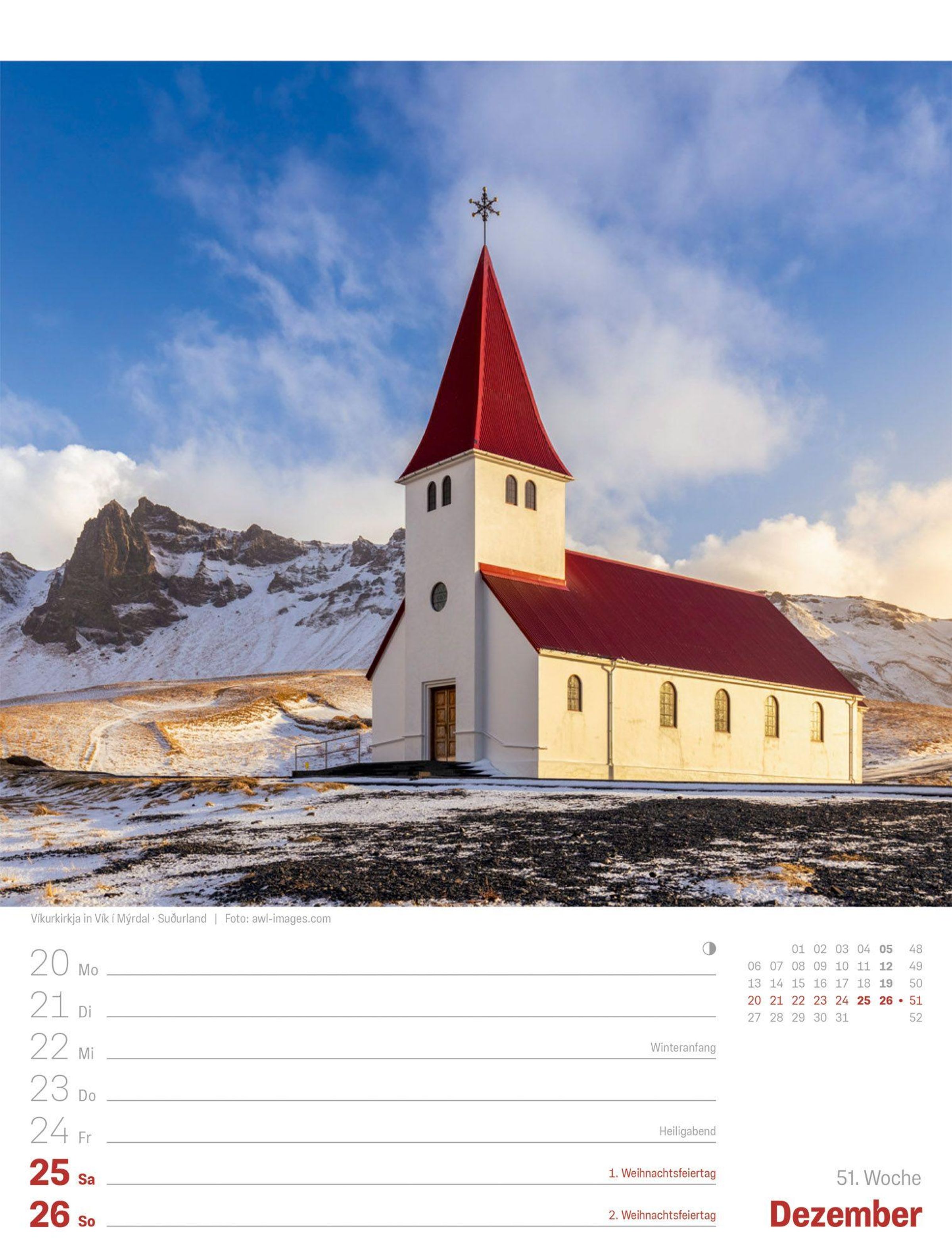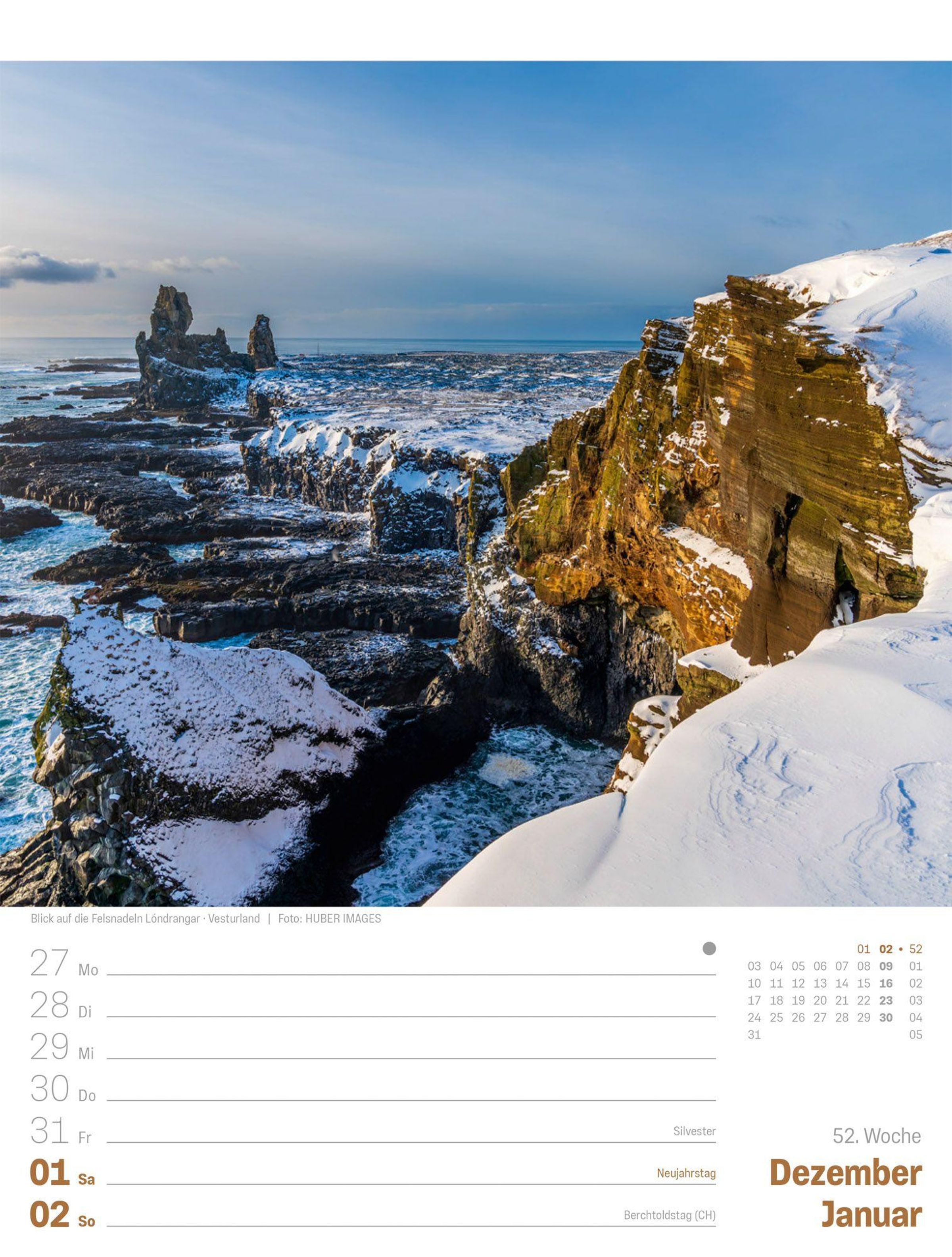 Sagenhaft und bildgewaltig: Island, das Land aus Feuer und Eis, ist mit seiner kontrastreichen Landschaft ein Sehnsuchtsort für alle, die von den Kräften der Natur fasziniert sind. Mit 53 beeindruckenden Reisefotos nehmen wir Sie mit auf die größte Vulkaninsel der Erde, zeigen Ihnen einen spannenden Mix aus heißen Quellen, endloser Weite und spektakulären geologischen Formationen. Übersichtliches Kalendarium mit Platz für Ihre Einträge und dazu jede Woche neuer Rätselspaß: Kreuzworträtsel und Sudokus auf allen Rückseiten.