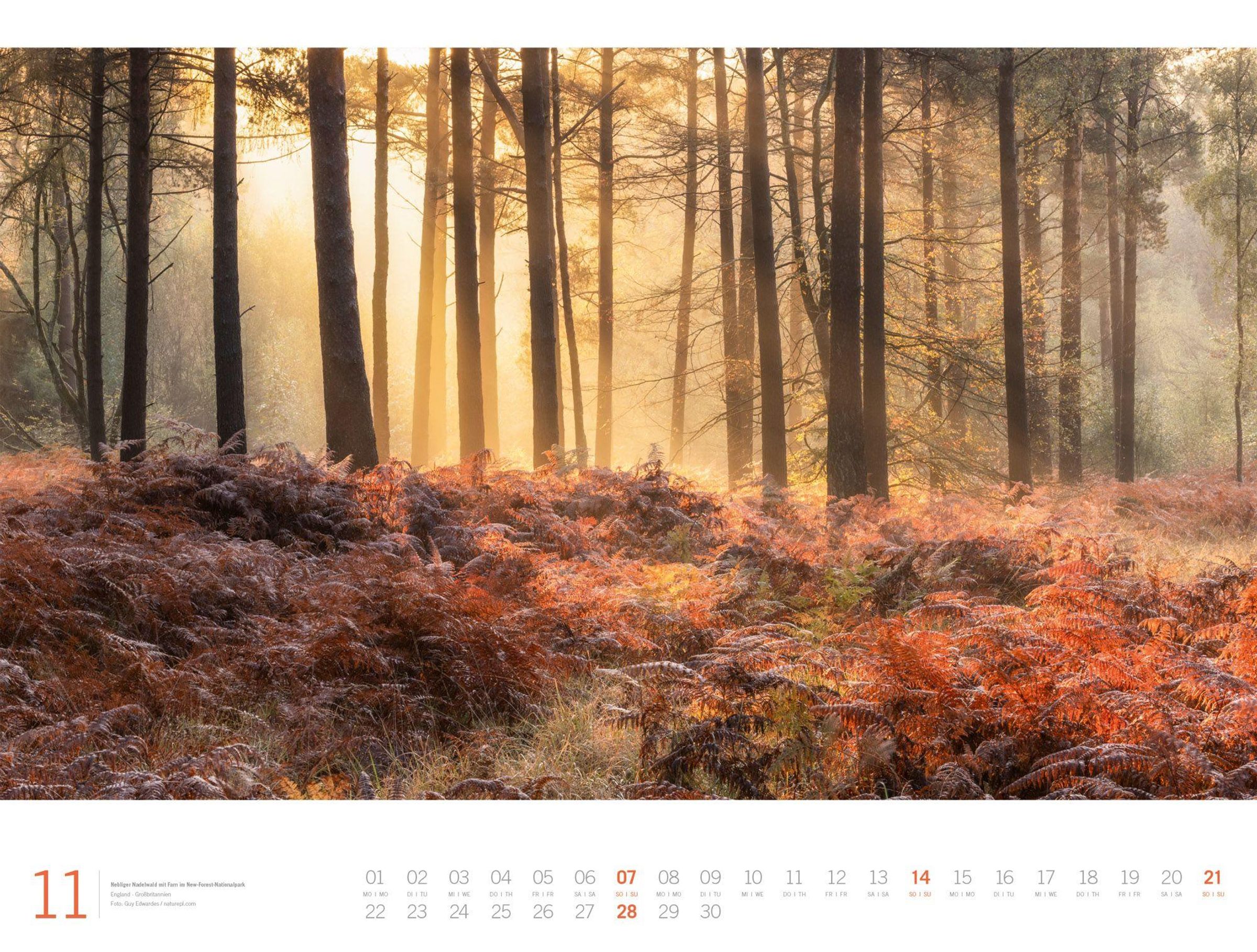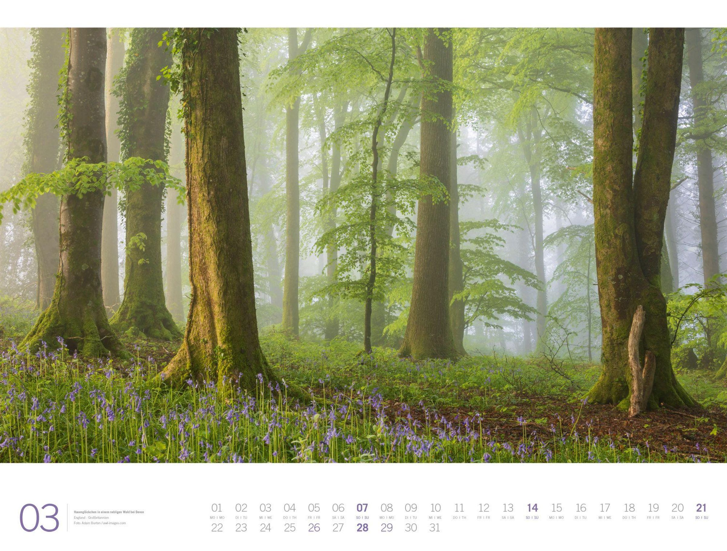 Wenn es grün duftet, man weichen Boden unter den Füßen hat und immer wieder Sonnenstrahlen durch die Äste brechen, dann geht man mit Sicherheit gerade durch einen Wald. Die unverwechselbare Atmosphäre der dicht aneinander stehenden Bäume, Vogelgezwitscher und knackendes Holz versetzen Menschen bei jedem Waldspaziergang in einen besonderen Zustand der Entspannung - und das schaffen auch die atmosphärischen und lichtdurchfluteten Fotografien dieses Kalenders.