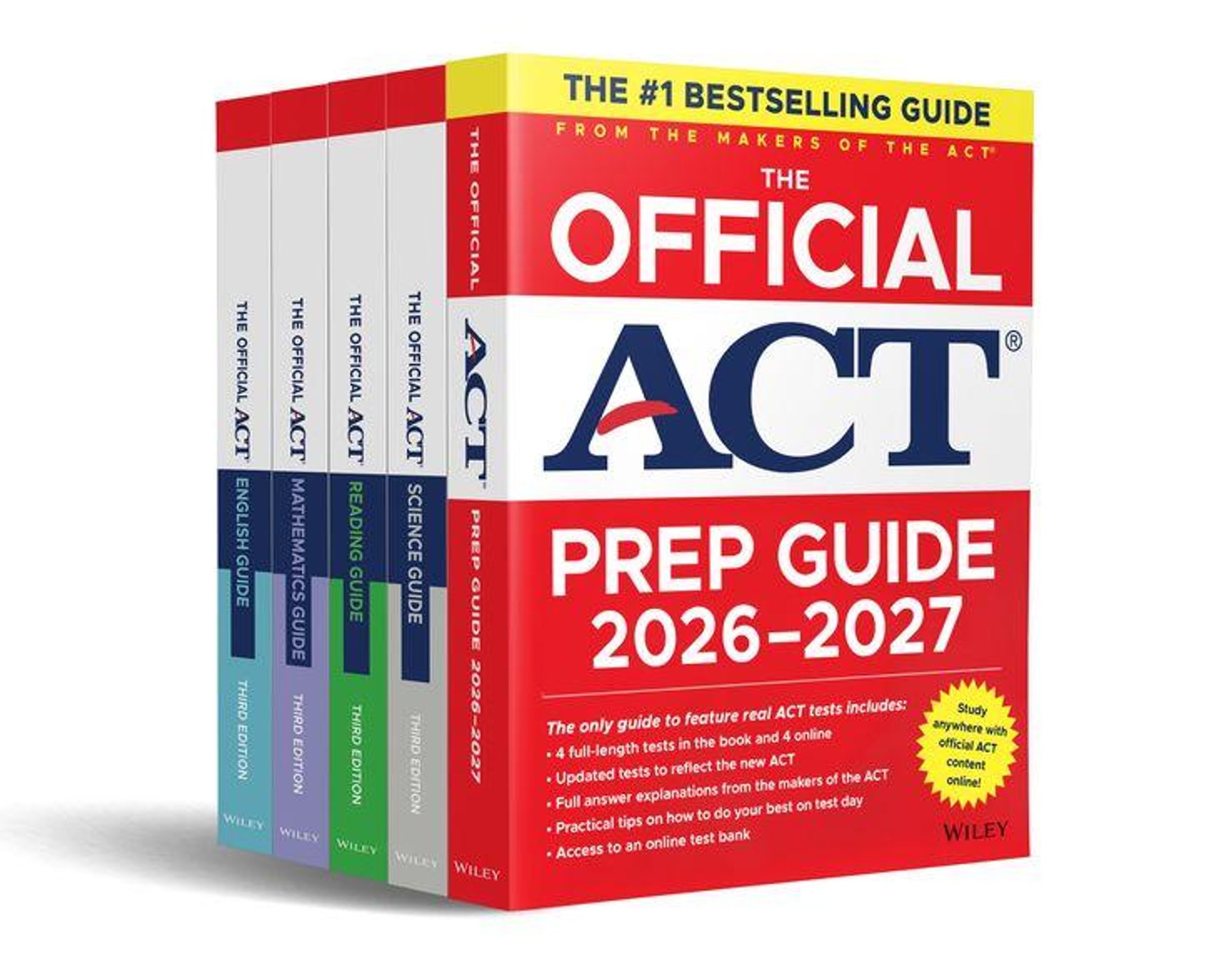 Save big on five total study guides, including the latestOfficial ACT Prep Guide with new writing samples and prompts. Build your skills before test day with four practice tests in your "Big Red Book."