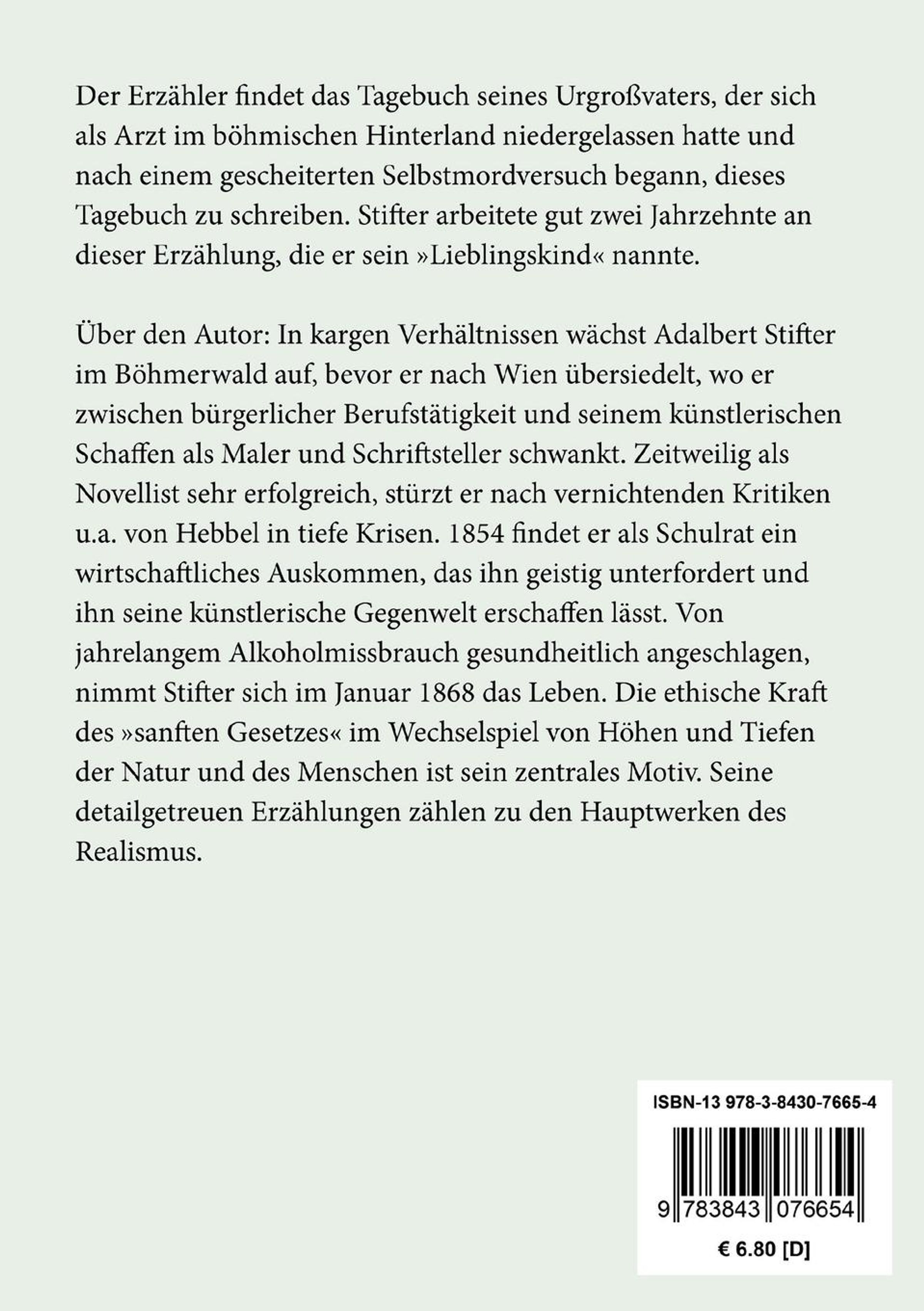 In kargen Verhältnissen wächst Adalbert Stifter im Böhmerwald auf, bevor er nach Wien übersiedelt, wo er zwischen bürgerlicher Berufstätigkeit und seinem künstlerischen Schaffen als Maler und Schriftsteller schwankt. Zeitweilig als Novellist sehr erfolgreich, stürzt er nach vernichtenden Kritiken u. a. von Hebbel in tiefe Krisen. 1854 findet er als Schulrat ein wirtschaftliches Auskommen, das ihn geistig unterfordert und ihn seine künstlerische Gegenwelt erschaffen lässt. Von jahrelangem Alkoholmissbrauch gesundheitlich angeschlagen, nimmt Stifter sich im Januar 1868 das Leben. Die ethische Kraft des >>sanften Gesetzes<< im Wechselspiel von Höhen und Tiefen der Natur und des Menschen ist sein zentrales Motiv. Seine detailgetreuen Erzählungen zählen zu den Hauptwerken des Realismus.
