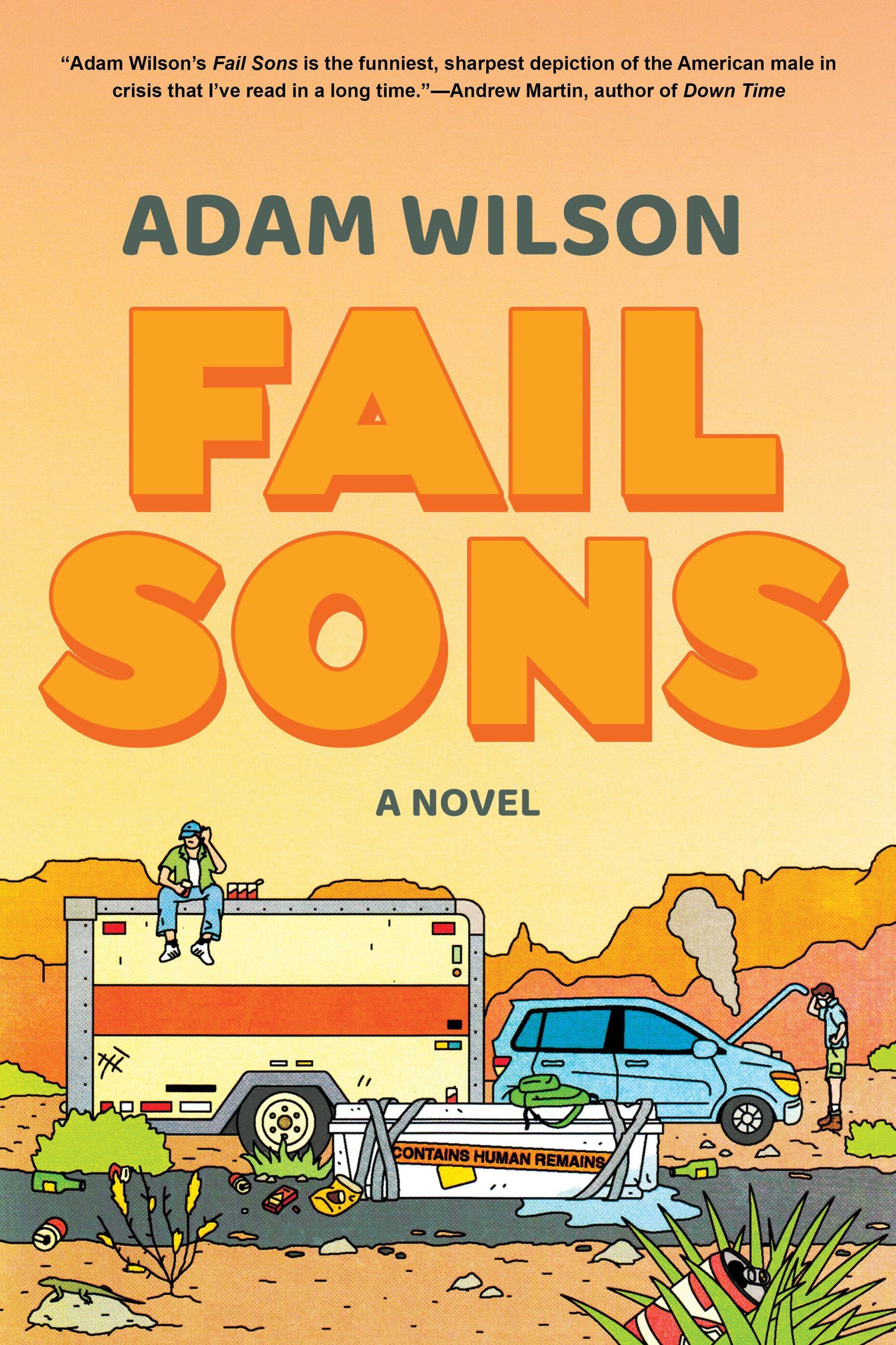 „FAIL SONS“. Darunter „A NOVEL“. Grafik: Zwei Männer, ein Wohnwagen, Auto, Kiste mit „CONTAINS HUMAN REMAINS“., Buch