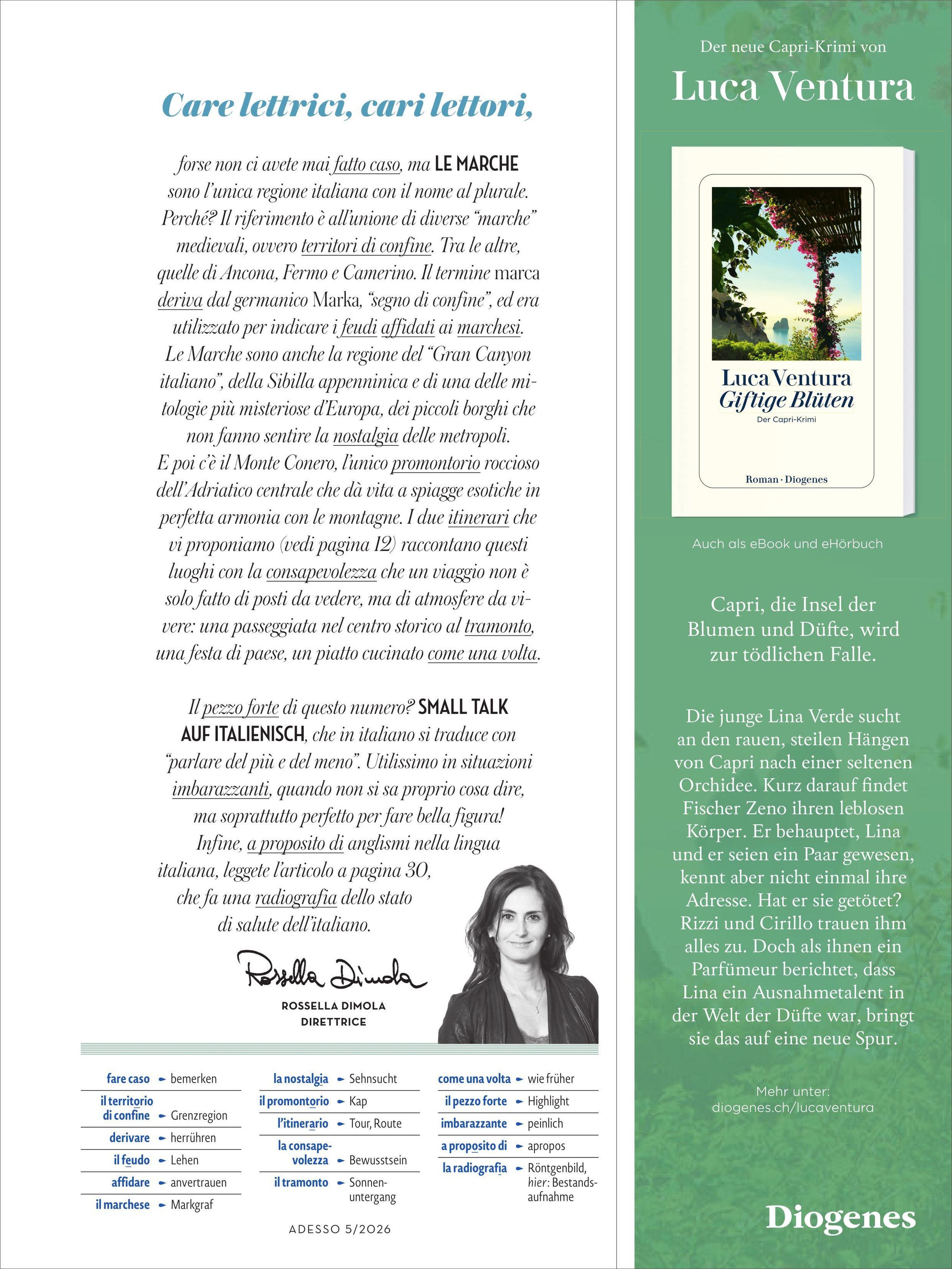 * Titelthema: Marche - Exotische Strände und wilde Berge: Frühlingszauber in den Marken! * Le Guide di Adesso: Cannobio. Das Juwel am Lago Maggiore * L'Italia a Tavola: Gli agretti. Der Mönchsbart hat Saison! * Stile Libero: Italiano, come stai? Italienisch im gesunden Wandel oder in Gefahr?