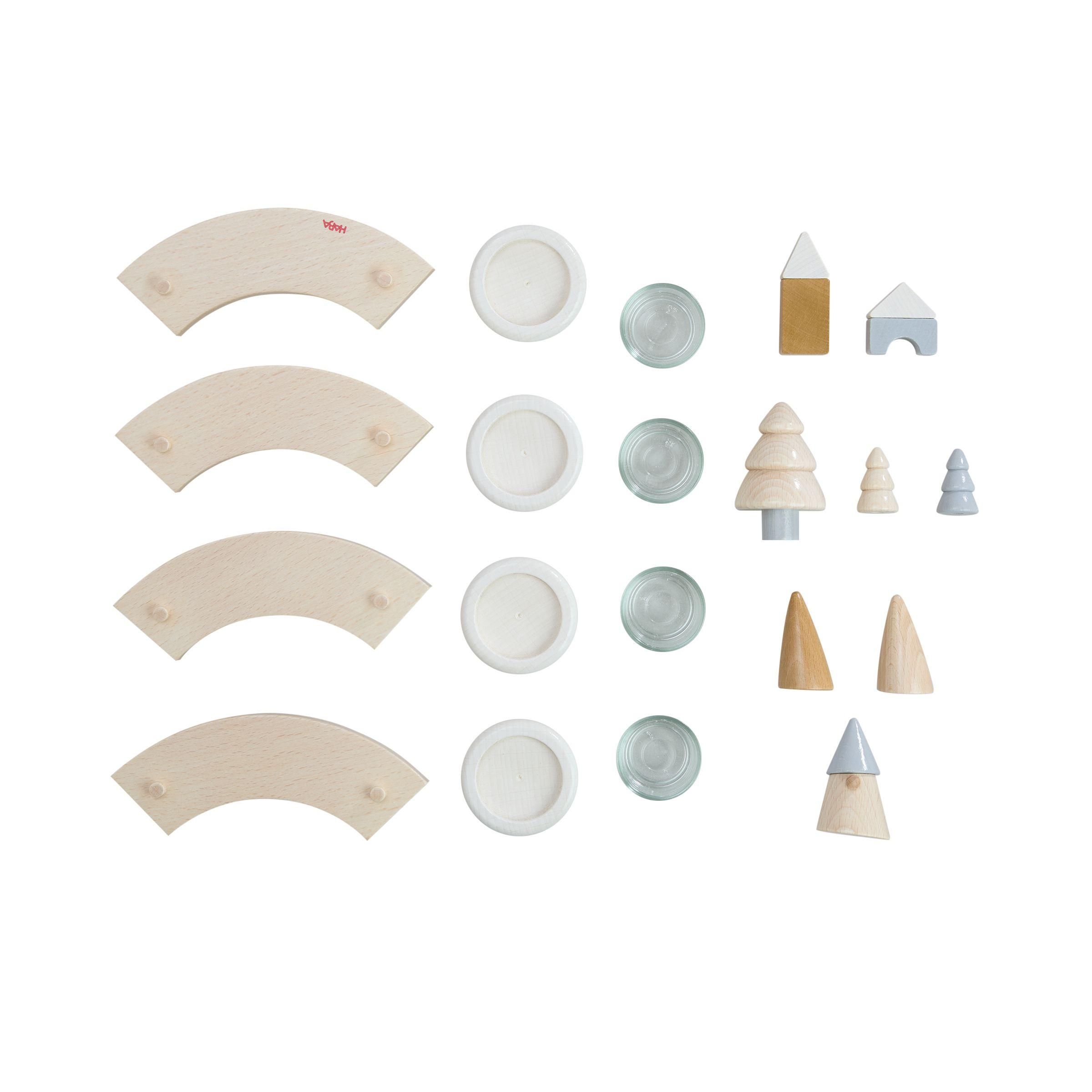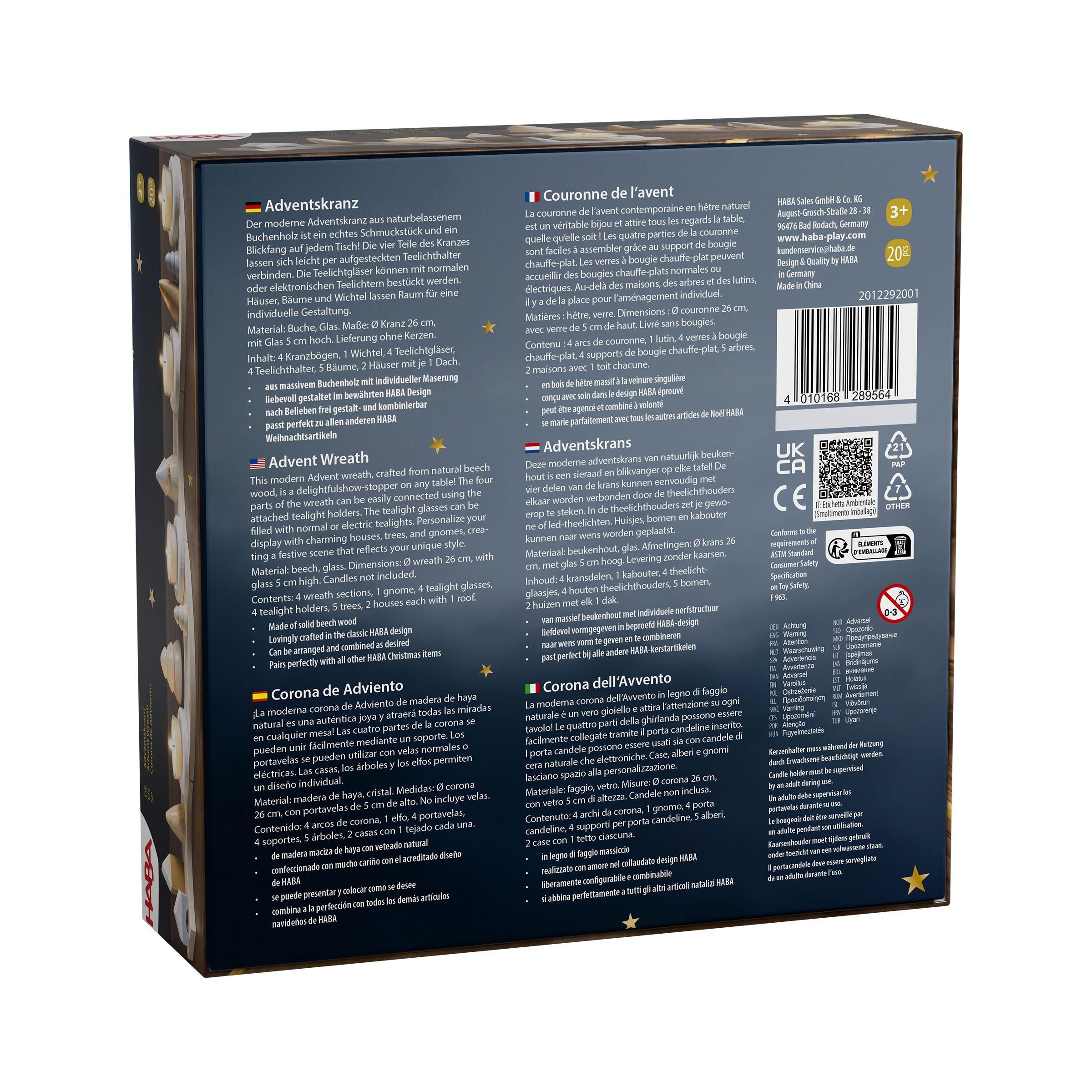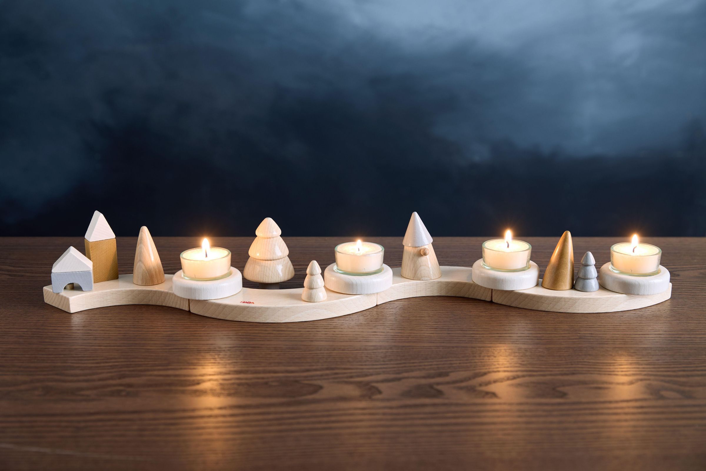 Der moderne Adventskranz aus naturbelassenem Buchenholz ist ein echtes Schmuckstück und ein Blickfang auf jedem Tisch! Die vier Teile des Kranzes lassen sich leicht per aufgesteckten Teelichthalter verbinden. Die Teelichtgläser können mit normalen oder elektronischen Teelichtern bestückt werden. Häuser, Bäume und Wichtel lassen Raum für eine individuelle Gestaltung.