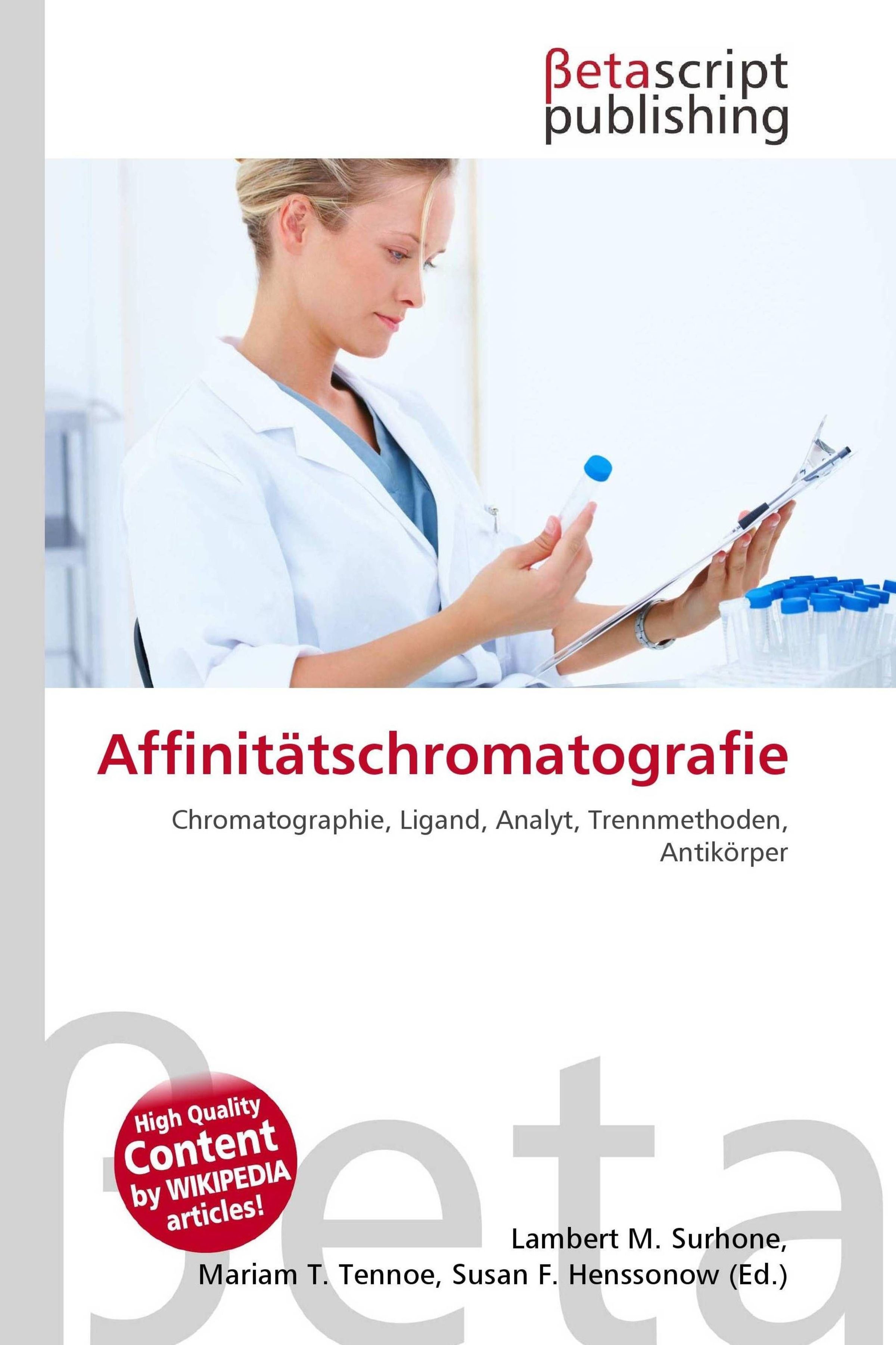 Please note that the content of this book primarily consists of articles available from Wikipedia or other free sources online. Die Affinitätschromatographie, in der Standardsprache auch Affinitätschromatografie, ist ein chromatographisches Trennverfahren zur Isolation eines Analyten aus einer Lösung verschiedener Stoffe. Voraussetzung ist, dass ein geeigneter Ligand (Bindungspartner) zu dem interessierenden Analyten (Protein) zur Verfügung steht. Sie ist eine der leistungsfähigsten Trennmethoden. Die verwendeten Säulen sind jedoch relativ kostspielig, so dass das Verfahren nur in besonderen Fällen beziehungsweise im kleinen Maßstab (Labormaßstab) zum Einsatz kommt.