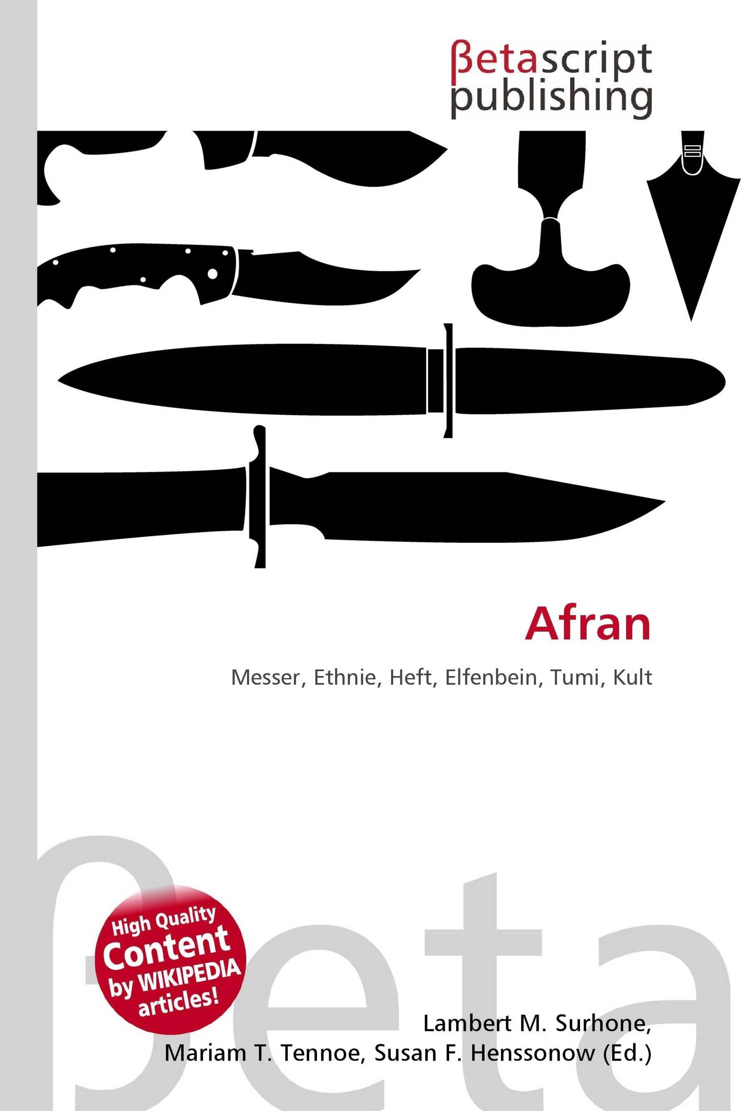 Please note that the content of this book primarily consists of articles available from Wikipedia or other free sources online. Das Afran- oder Ohoto-Messer ist ein afrikanisches Messer. Afrikanische Messer wurden in verschiedenen Ländern und von verschiedenen Ethnien Afrikas als Kriegs-, Jagd-, Kultur- und Standeswaffe entwickelt und genutzt. Die jeweilige Bezeichnung der Waffe bezieht sich auf eine Ausprägung dieses Waffentyps, die einer bestimmten Ethnie zugeordnet wird. Das Afran- oder Ohoto-Messer hat eine breite, bauchige, einschneidige Klinge. Die Klinge hat keinen Hohlschliff und keinen Mittelgrat. Bei den meisten Exemplaren ist die Klinge mit traditionellen oder kultischen Mustern durchbrochen. Das Heft besteht aus Holz, Elfenbein oder Metall. Das Heft und der Knauf sind meist in Form von Kugeln gearbeitet. Es diente als zeremonielles Messer und wurde bei der Ethnie der Ashanti benutzt.