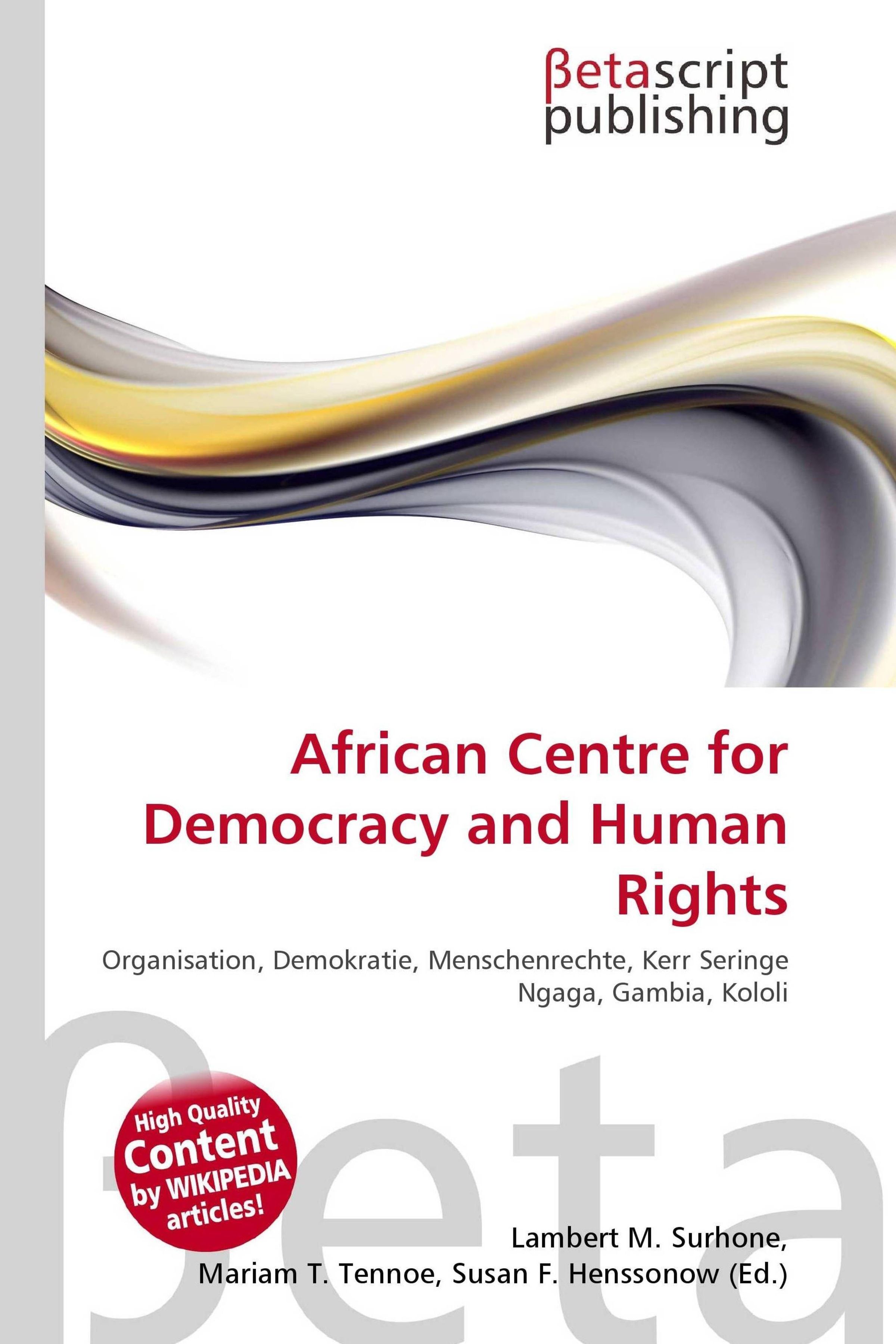 Please note that the content of this book primarily consists of articles available from Wikipedia or other free sources online. Das African Centre for Democracy and Human Rights Studies (ACDHRS) (dt. Afrikanisches Zentrum für Demokratie und Studien für Menschenrechte) ist eine Organisation, die politische Untersuchungen betreibt und Schulungen anbietet. Der Forschungsschwerpunkt liegt auf Demokratie und der Umsetzung der Menschenrechte in Afrika. Das ACDHRS führt dazu Workshops und Foren durch. Der Sitz der Organisation liegt in Gambia in Kerr Seringe bei Kololi, im 2001 eingeweihtem Zoe Tembo Building am Bertil Harding Highway. Direktorin ist seit 2001 Hannah Forster.