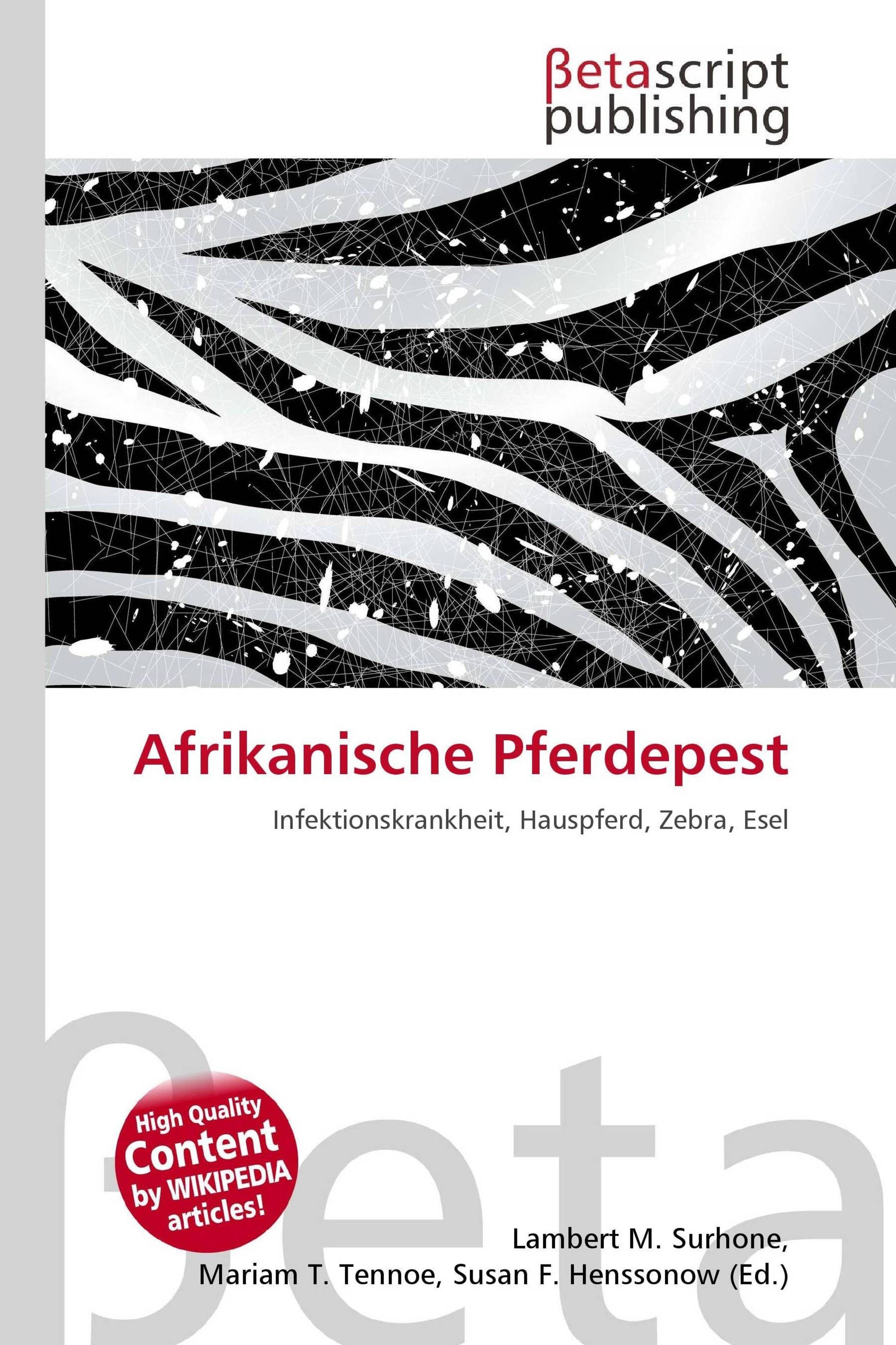 Please note that the content of this book primarily consists of articles available from Wikipedia or other free sources online. Die Afrikanische Pferdepest, Pferdepest oder Afrikanische Pferdesterbe (engl. African Horse Sickness, AHS) ist eine virale Infektionskrankheit bei Pferden, Zebras und Eseln, die zu den anzeigepflichtigen Tierseuchen gehört. Krankheitsauslösender Erreger ist das African Horse Sickness Virus (AHS), ein unbehülltes, doppelsträngiges RNA-Virus (dsRNA), ein Orbivirus aus der Familie der Reoviridae. Von diesem Virus sind bislang neun verschiedene Serotypen bekannt. Der Erreger ist besonders resistent und kann bei kühler Witterung im Freien mehrere Jahre lang überleben.