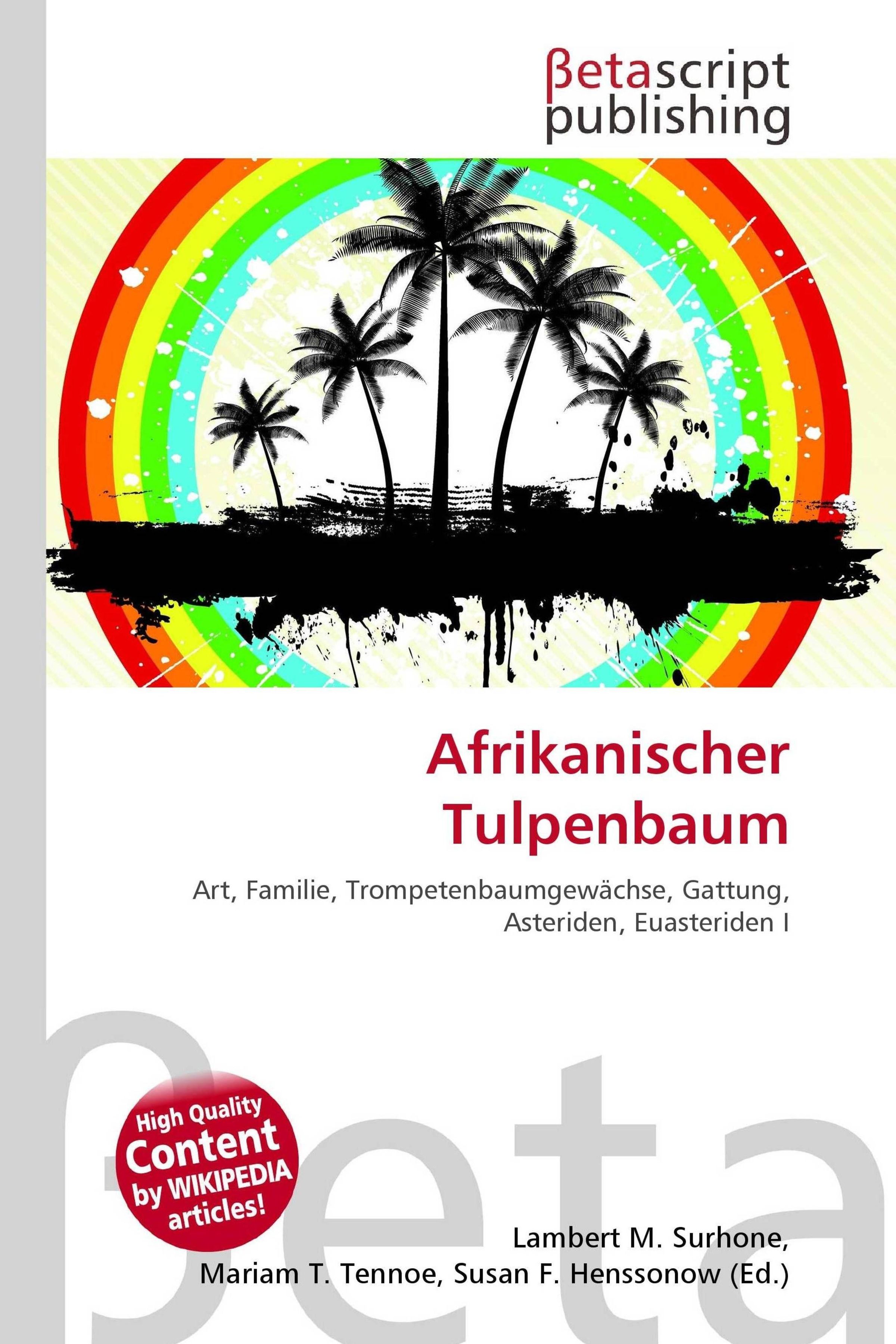 "Betascript publishing", "Afrikanischer Tulpenbaum", "Art, Familie, Trompetenbaumgewächse, Gattung, Asteriden, Euasteriden I". Silhouetten von Palmen vor einem Regenbogenhintergrund., Buch