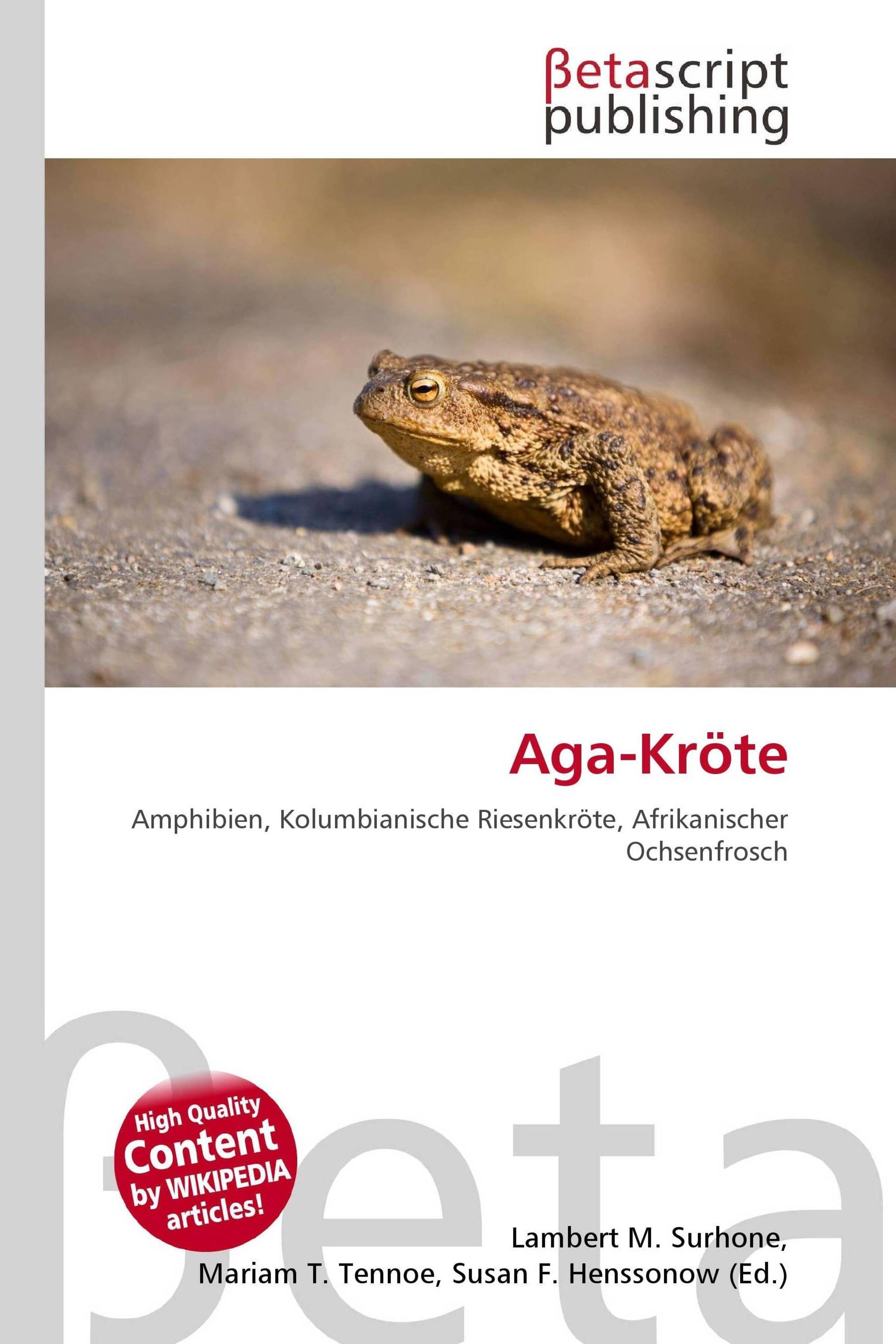 Logo von Betascript Publishing oben. TiteI: "Aga-Kröte". Eine Kröte auf einer sandigen Oberfläche., Buch