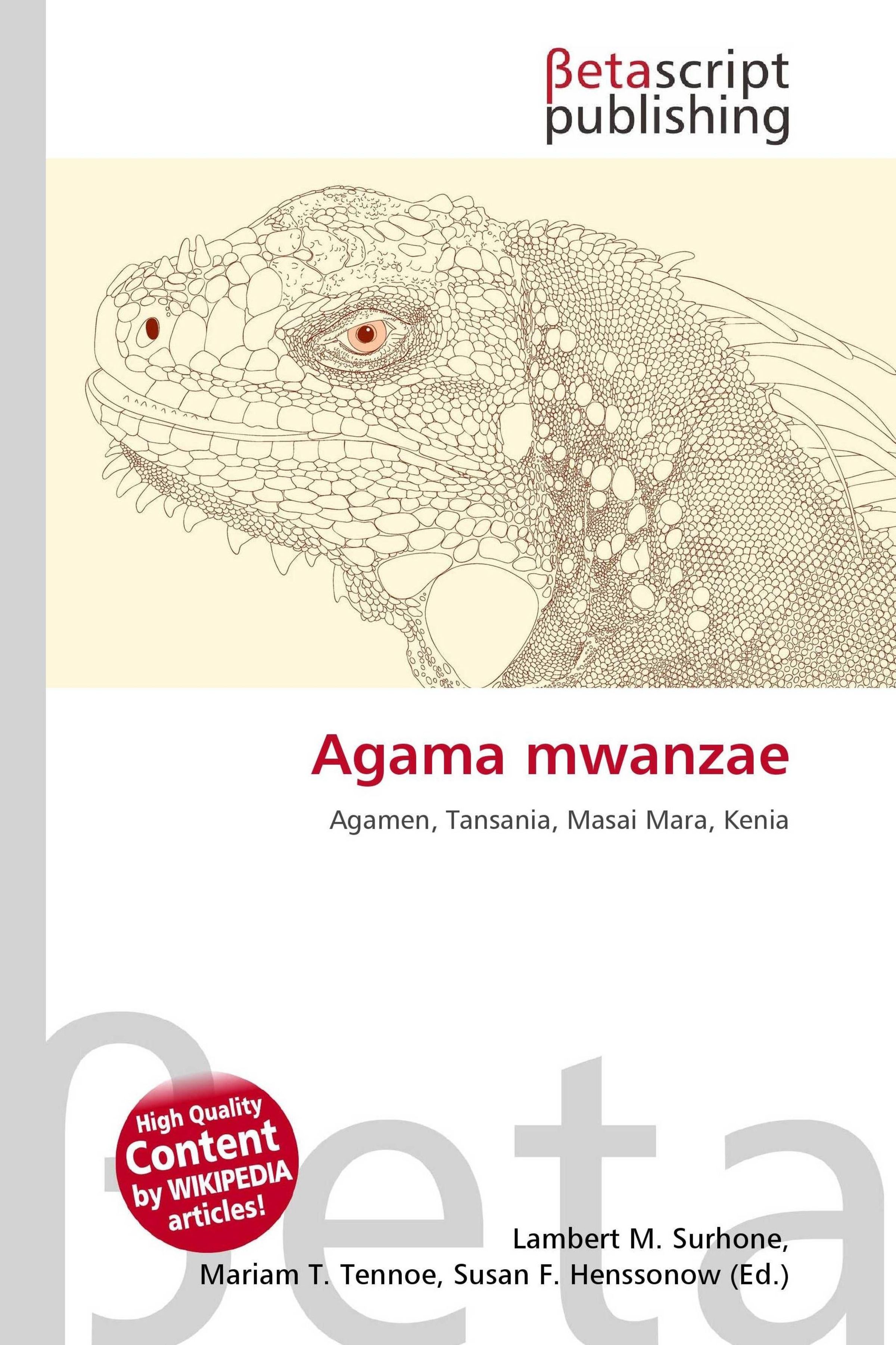 Please note that the content of this book primarily consists of articles available from Wikipedia or other free sources online. Agama mwanzae ist eine afrikanische Agamenart. Ihr kleines Verbreitungsgebiet um fasst den Nordwesten Tansanias, den Masai Mara-Nationalpark in Kenia und den äußersten Osten Ruandas. Es liegt inselartig im Verbreitungsgebiet der ähnlichen Siedleragame (Agama agama ). Agama mwanzae wird maximal 32 Zentimeter lang. Bei dominierende Männchen sind Kopf, Kehle und Rücken rötlich, der Rest des Körpers ist bläulich. Untergeordnete Männchen sind grau gesprenkelt mit einer blauen Linie auf dem Rücken entlang der Wirbelsäule, Weibchen und Jungtiere sind bräunlich mit unregelmäßigen dunklen Streifen.
