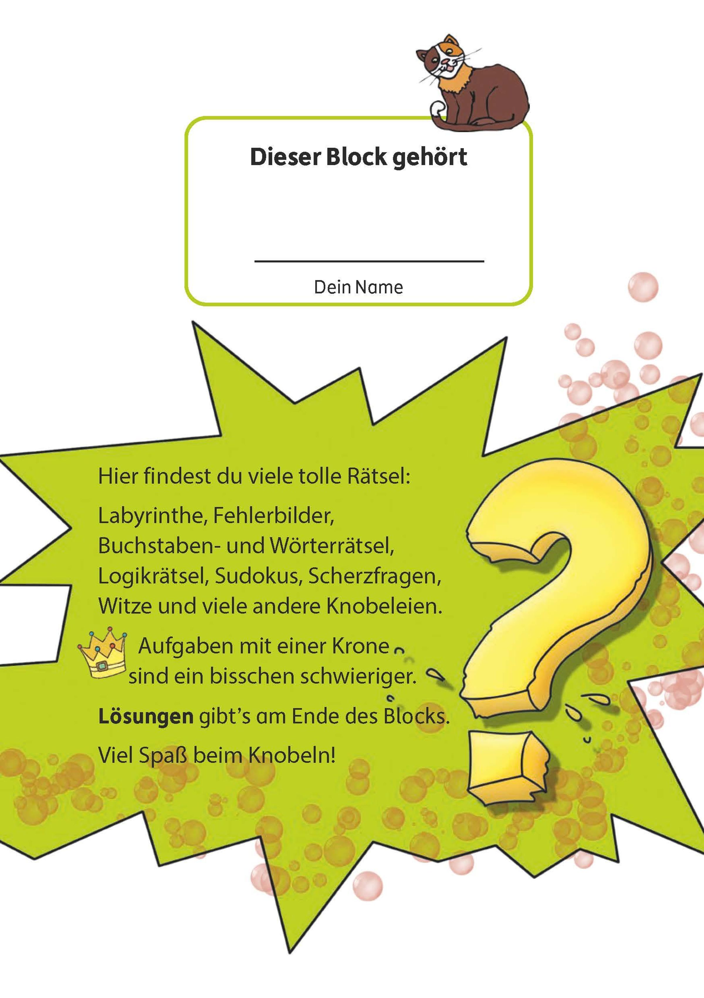- KUNTERBUNTE WELTEN ENTDECKEN Auf jeder Seite warten spannende und abwechslungsreiche Rätsel. Die 57 kurzweiligen Aufgaben und liebevoll gestaltete Illustrationen regen die Fantasie an und sorgen für zusätzliche Motivation und Spaß beim Knobeln. Am Ende des Blocks finden Sie alle Lösungen, um die Ergebnisse gemeinsam mit Ihrem Kind abzugleichen.