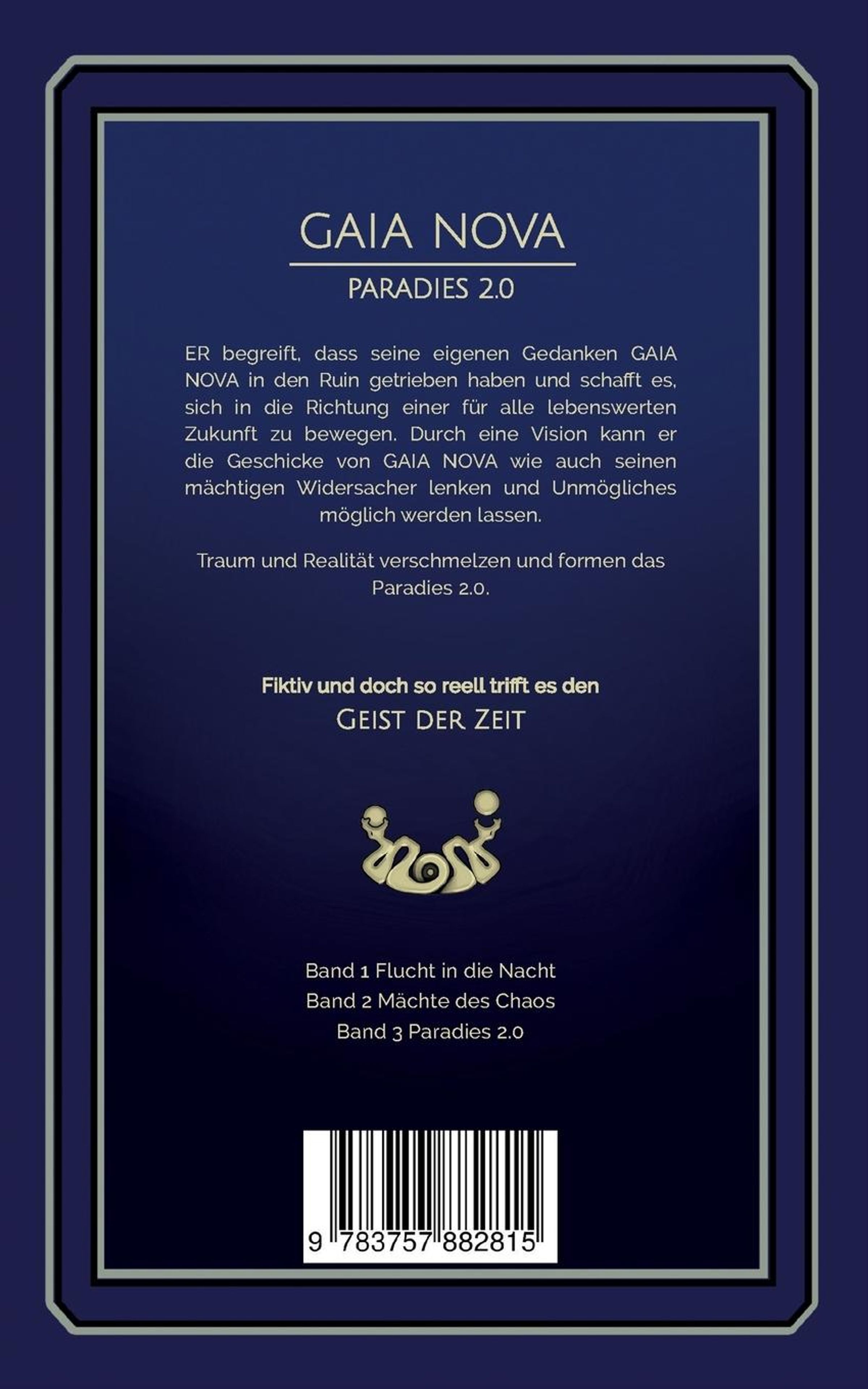 Teil 3: Paradies 2.0 ER begreift, dass seine eigenen Gedanken GAIA NOVA in den Ruin getrieben haben und schafft es, sich in die Richtung einer für alle lebenswerten Zukunft zu bewegen. Durch eine Vision kann er die Geschicke von GAIA NOVA wie auch seinen mächtigen Widersacher lenken und Unmögliches möglich werden lassen. Traum und Realität verschmelzen und formen das Paradies 2.0.