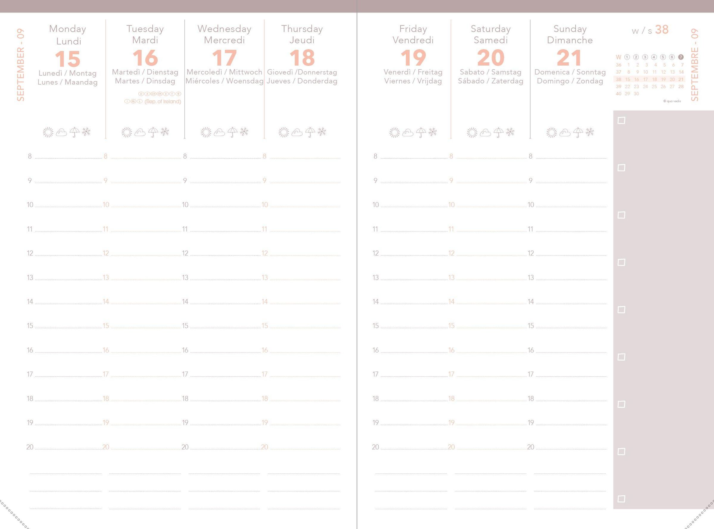 Farbiger Wochenkalender mit einer Woche auf 2 Seiten für eine gute Übersicht über die gesamte Woche. Enthält eine monatliche Doppelseite am Anfang jedes Monats, um einen Überblick über bevorstehende Ereignisse zu erhalten Weißes Clairefontaine-Papier, für ein einzigartiges Schreiberlebnis. Abtrennbare perforierte Ecken für eine schnelle und einfache Or ientierung. Abnehmbarer Einband und nachfüllbarer Innenteil für eine lange Nutzung. Aufbewahrungstaschen für kleine Dokumente.
