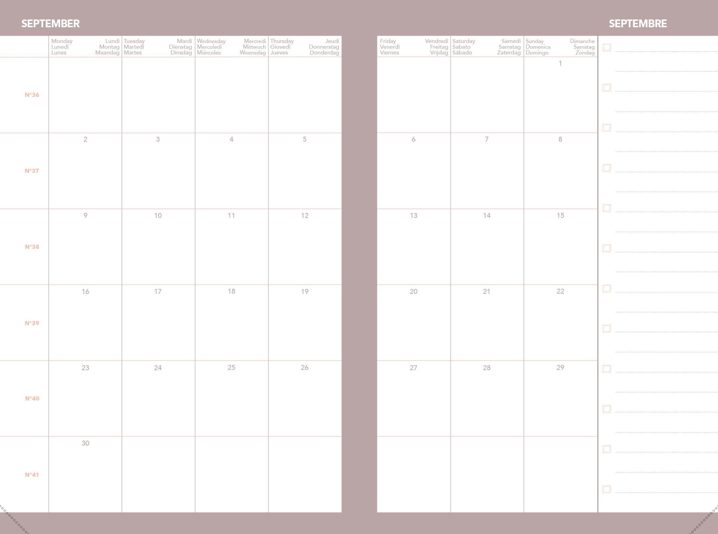 Farbiger Wochenkalender mit einer Woche auf 2 Seiten für eine gute Übersicht über die gesamte Woche. Enthält eine monatliche Doppelseite am Anfang jedes Monats, um einen Überblick über bevorstehende Ereignisse zu erhalten Weißes Clairefontaine-Papier, für ein einzigartiges Schreiberlebnis. Abtrennbare perforierte Ecken für eine schnelle und einfache Or ientierung. Abnehmbarer Einband und nachfüllbarer Innenteil für eine lange Nutzung. Aufbewahrungstaschen für kleine Dokumente und ein herausnehmbares Register für Ihre Kontakte.