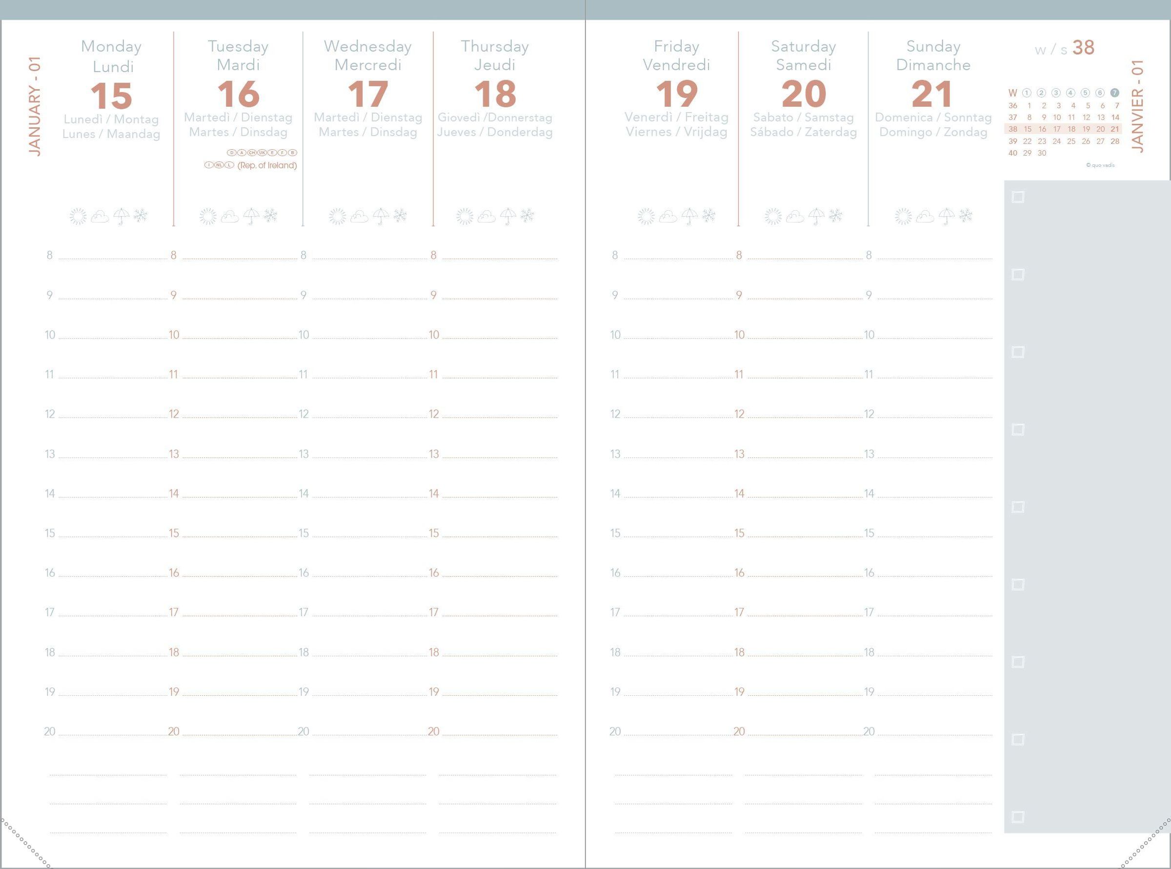 Farbiger Wochenkalender mit einer Woche auf 2 Seiten für eine gute Übersicht über die gesamte Woche. Enthält eine monatliche Doppelseite am Anfang jedes Monats, um einen Überblick über bevorstehende Ereignisse zu erhalten Weißes Clairefontaine-Papier, für ein einzigartiges Schreiberlebnis. Abtrennbare perforierte Ecken für eine schnelle und einfache Or ientierung. Abnehmbarer Einband und nachfüllbarer Innenteil für eine lange Nutzung. Aufbewahrungstaschen für kleine Dokumente und ein herausnehmbares Register für Ihre Kontakte.
