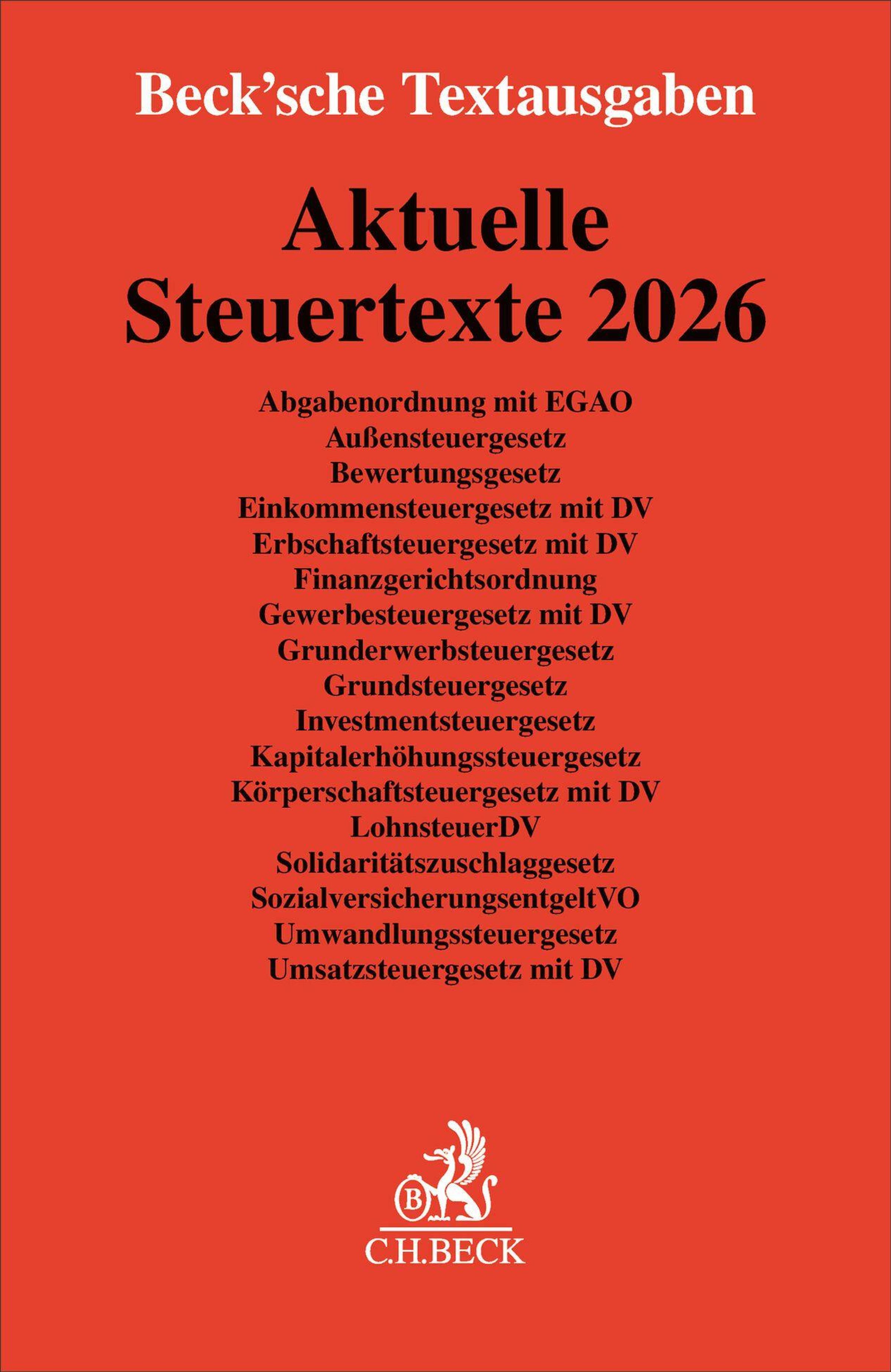 - Abgabenordnung mit EGAO, Außensteuergesetz, Bewertungsgesetz, Einkommensteuergesetz mit DV, Erbschaftsteuergesetz mit DV, Finanzgerichtsordnung, Gewerbesteuergesetz mit DV, Grunderwerbsteuergesetz, Grundsteuergesetz, Investmentsteuergesetz,Kapitalerhöhungssteuergesetz, Körperschaftsteuergesetz mit DV, LohnsteuerDV, Solidaritätszuschlaggesetz, SozialversicherungsentgeltVO, Umwandlungssteuergesetz, Umsatzsteuergesetz mit DV. Textausgabe. Rechtsstand: voraussichtlich 1. Januar 2026