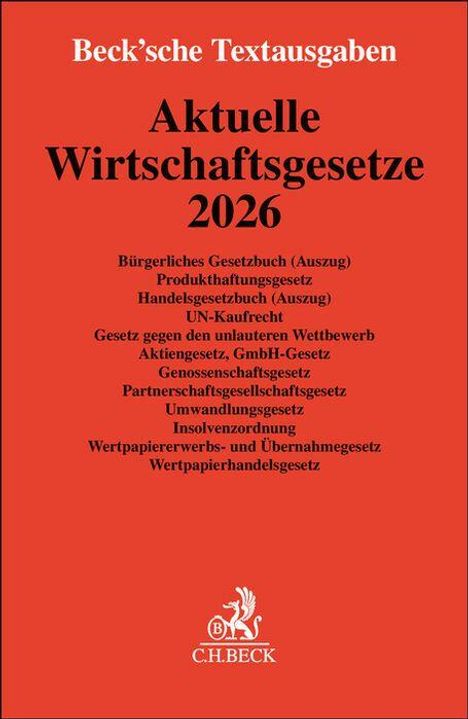 - Bürgerliches Gesetzbuch (Auszug), Produkthaftungsgesetz, Handelsgesetzbuch (Auszug), UN-Kaufrecht, Gesetz gegen den unlauteren Wettbewerb, Aktiengesetz, GmbH-Gesetz, Genossenschaftsgesetz, Partnerschaftsgesellschaftsgesetz, Umwandlungsgesetz,Insolvenzordnung, Wertpapiererwerbs- und Übernahmegesetz, Wertpapierhandelsgesetz. Textausgabe. Rechtsstand: 6. Oktober 2025