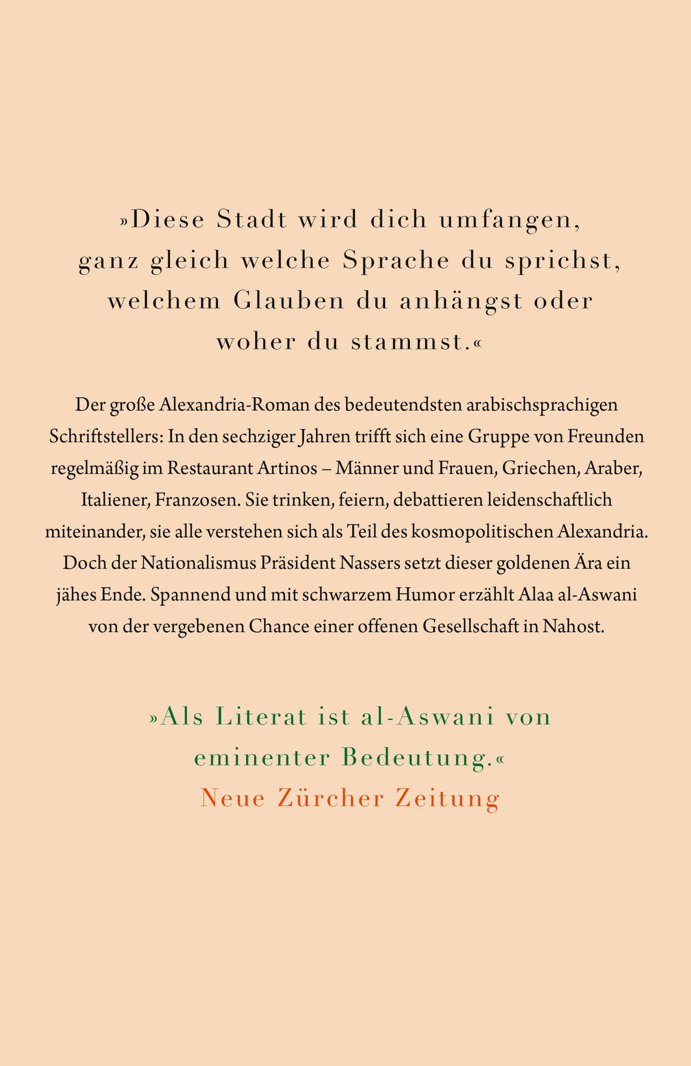 Der große Alexandria-Roman des bedeutendsten arabischsprachigen Autors der Gegenwart: In den sechziger Jahren trifft sich eine Gruppe von Freunden - ein Grieche, ein Italiener, eine Französin sowie ein Jude und ein Araber - in einem Café in Alexandria, um Widerstand zu leisten gegen die ausländerfeindliche Politik der Regierung Nassers. Die bunte Gesellschaft spricht Arabisch miteinander, sie alle verstehen sich als Teil des kosmopolitischen Alexandria. Doch der Nationalismus der verblendeten Herrscher treibt sie auseinander und zerstört nicht nur ihre kleine Gemeinschaft, sondern die multikulturelle Essenz der legendären Hafenstadt. Spannend und mit schwarzem Humor erzählt Alaa al-Aswani von der vergebenen Chance einer offenen Gesellschaft in Nahost.