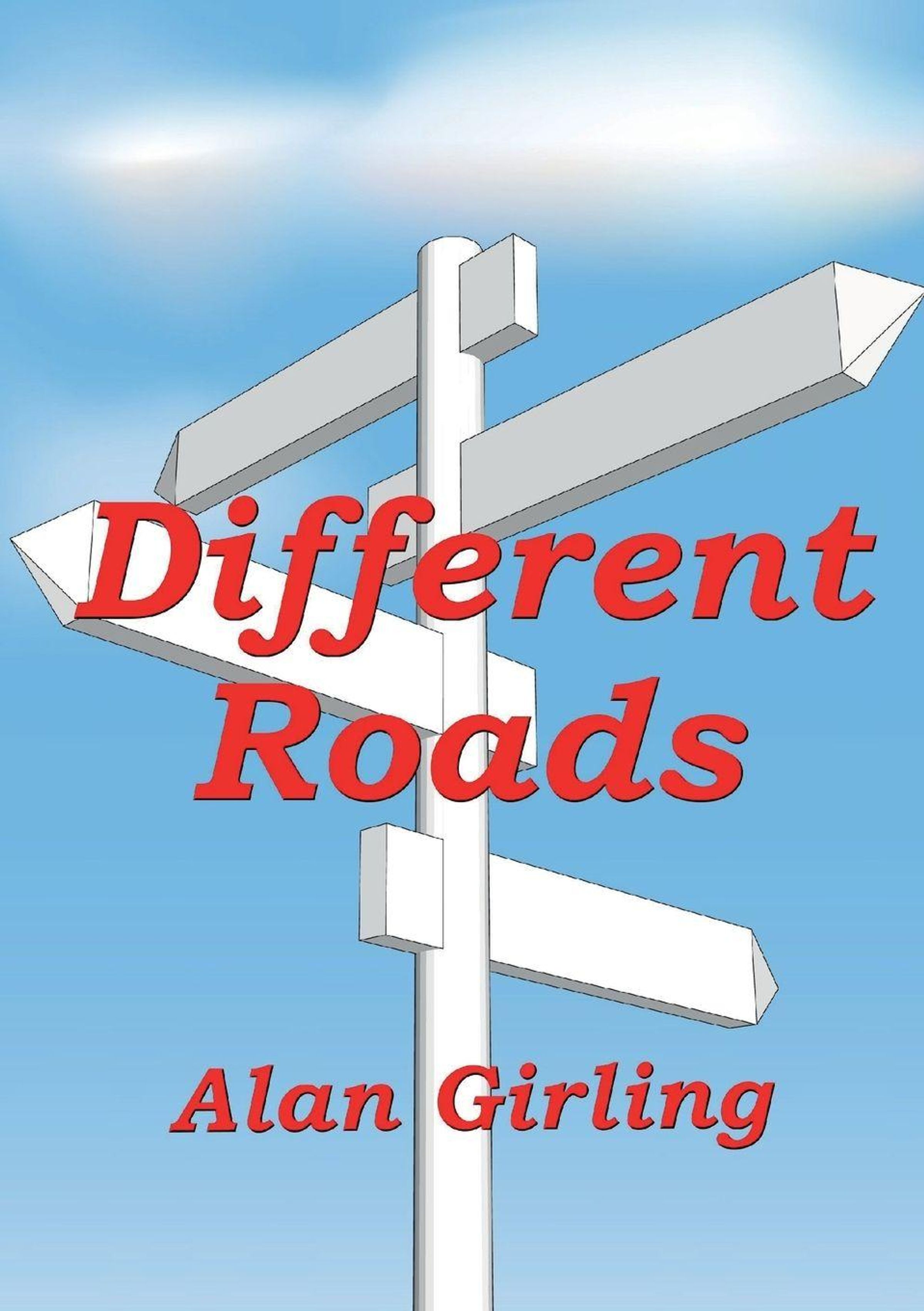 Text: Different Roads, Alan Girling. Illustration eines weißen Wegweisers vor blauem Himmel., Buch