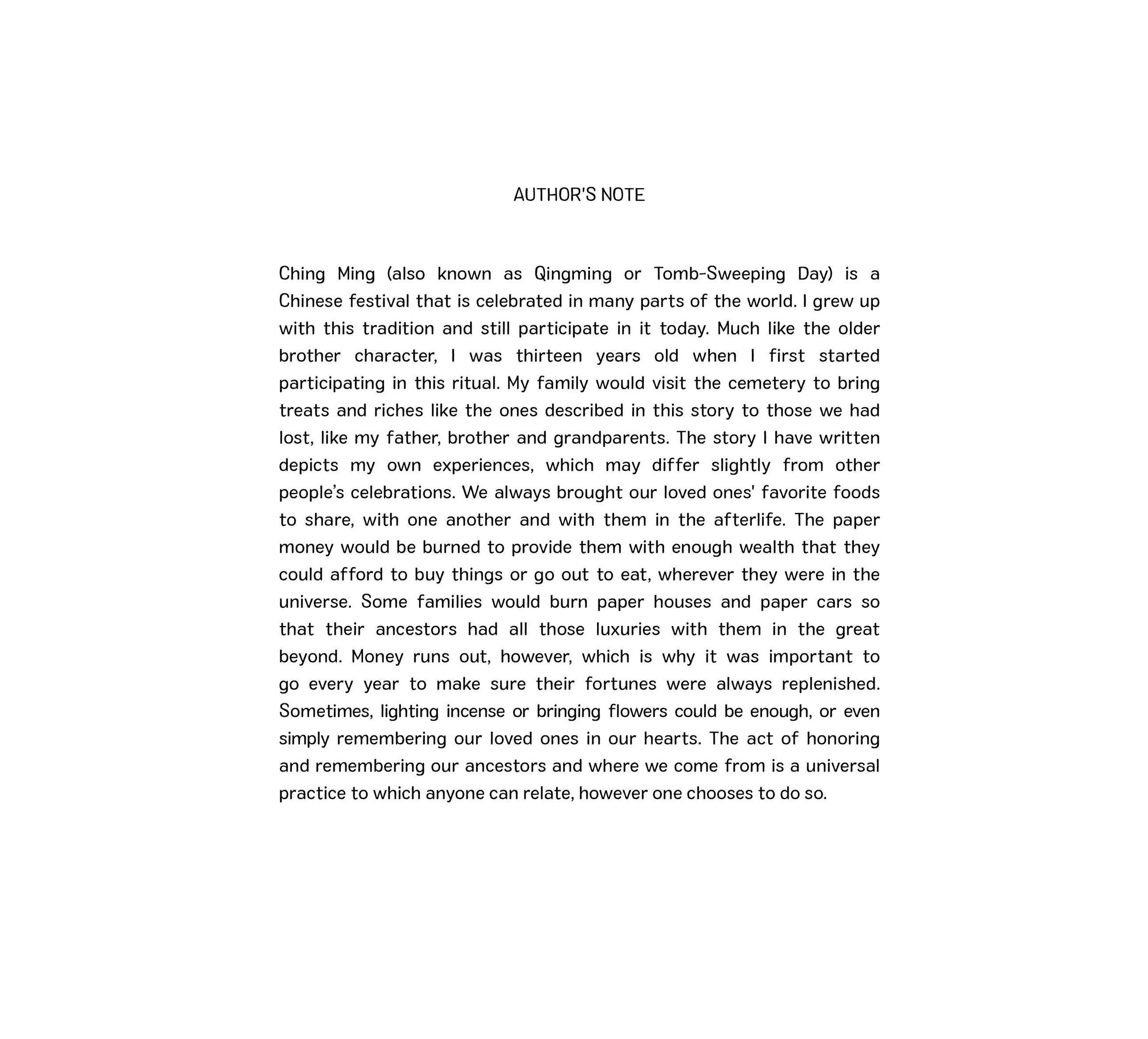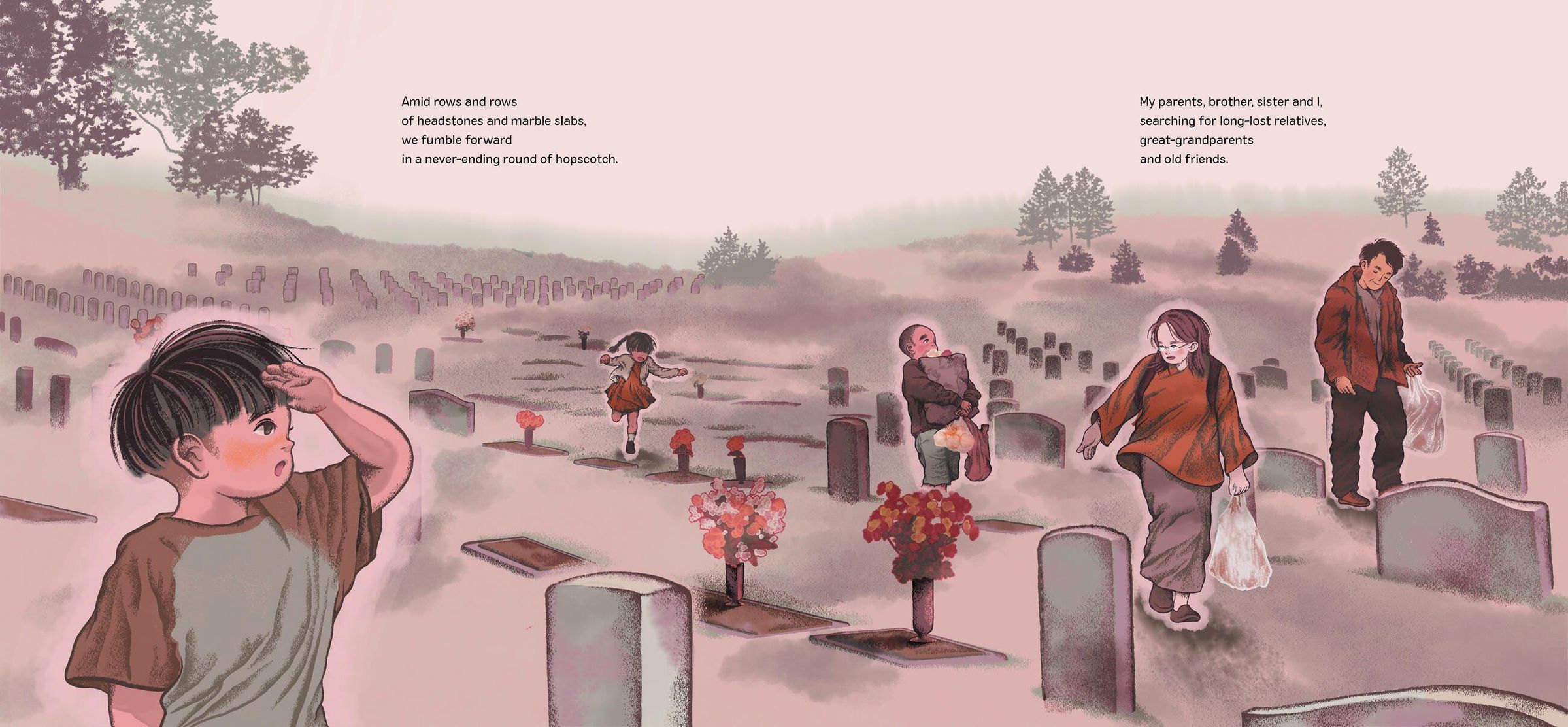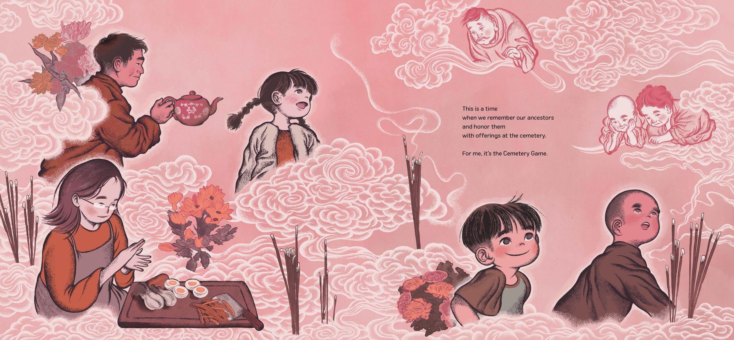 A young boy and his family arrive at the cemetery to celebrate Ching Ming, the day they and many other families remember and honor their ancestors. For the boy, the rituals of the day feel like a game - the Cemetery Game. The family members bring flowers and special foods to the gravesites of their relatives. They light incense, burn play money and bow together. The boy and his sister even find time for a laugh, imagining themselves at a tea party for ghosts! But as their older brother reminds them, this day is important and they need to pay attention. After all, one day this will all be their responsibility.