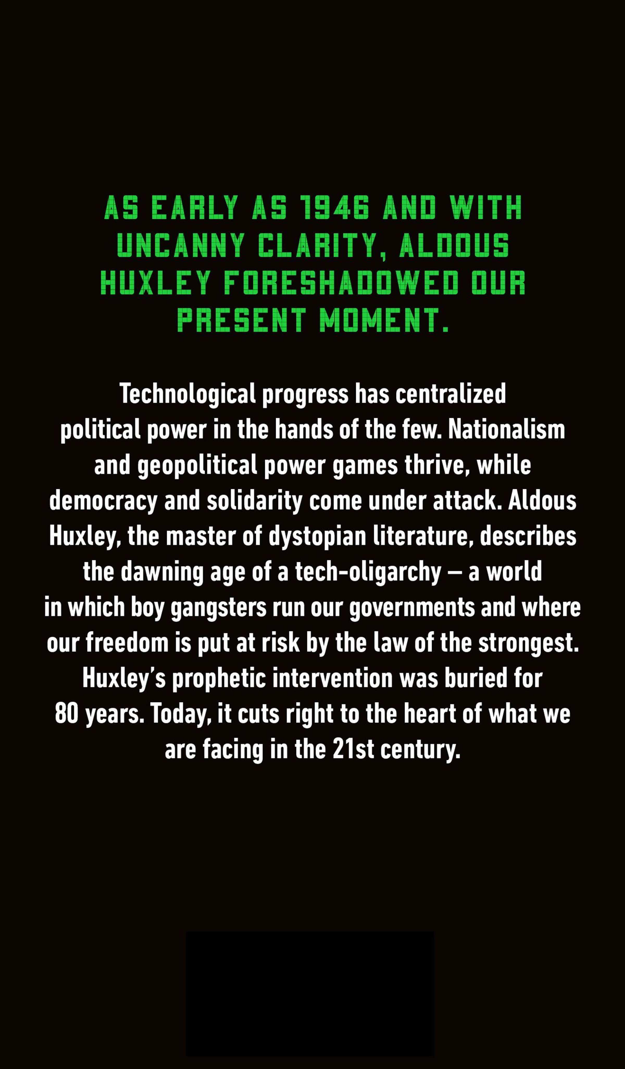 As early as 1946 and with uncanny clarity, Aldous Huxley foreshadowed our present moment where technological progress has centralized political power in the hands of the few. In times of social upheaval, nationalism and geopolitical power games thrive, while democracy and solidarity come under attack. Aldous Huxley, the master of dystopian literature, describes the dawning age of a tech-oligarchy - a world in which boy gangsters run our governments and where our freedom is put at risk by the law of the strongest. Huxley's prophetic intervention was buried for 80 years. Today, it cuts right to the heart of what we are facing in the 21st century.