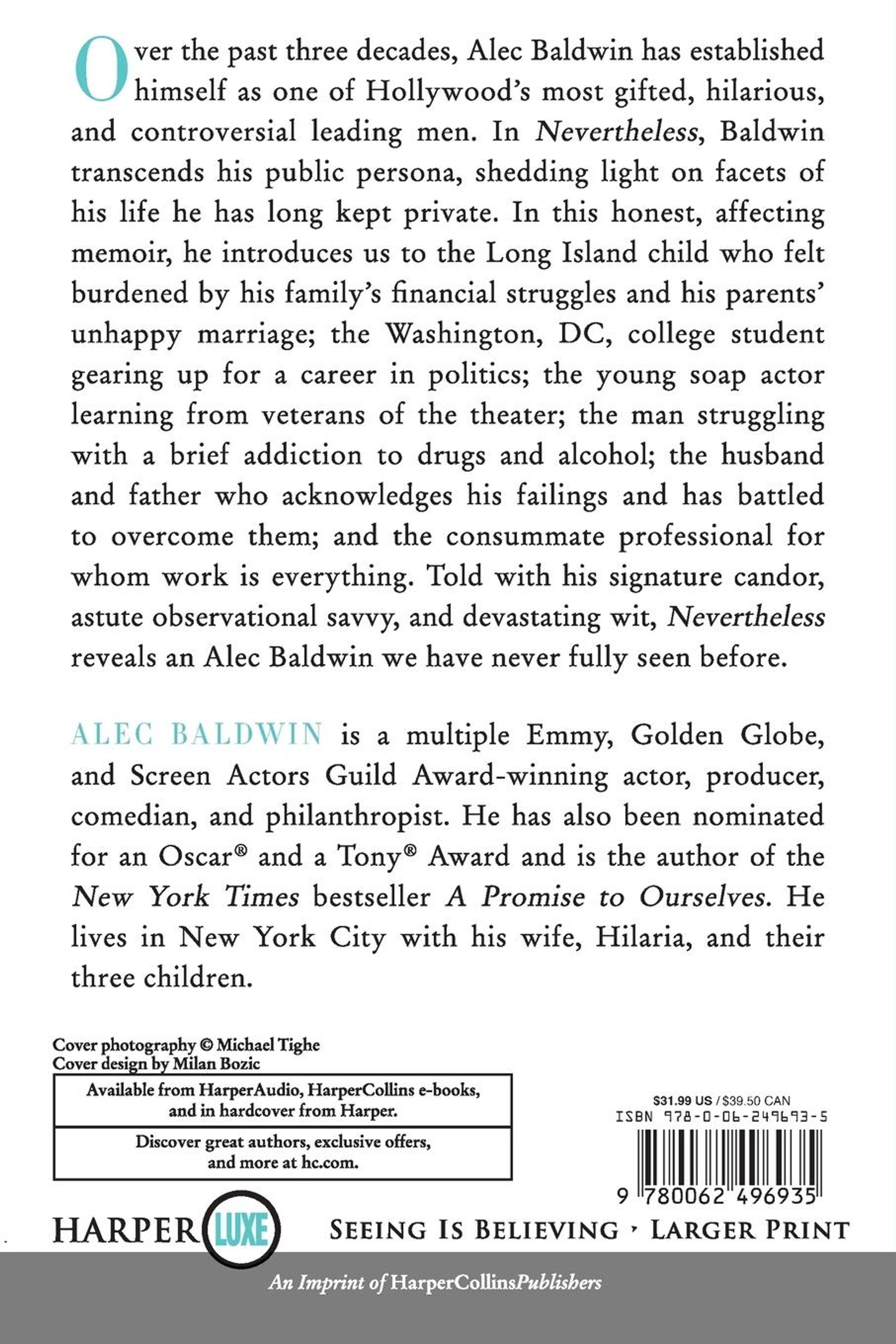 Over the past three decades, Alec Baldwin has established himself as one of Hollywood's most gifted, hilarious, and controversial leading men. In Nevertheless, Baldwin transcends his public persona, shedding light on facets of his life he has long kept private. In this honest, affecting memoir, he introduces us to the Long Island child who felt burdened by his family's financial struggles and his parents' unhappy marriage; the Washington, DC, college student gearing up for a career in politics; the young soap actor learning from veterans of the theater; the man struggling with a brief addiction to drugs and alcohol; the husband and father who acknowledges his failings and has battled to overcome them; and the consummate professional for whom work is everything. Told with his signature candor, astute observational savvy, and devastating wit, Nevertheless reveals an Alec Baldwin we have never fully seen before.