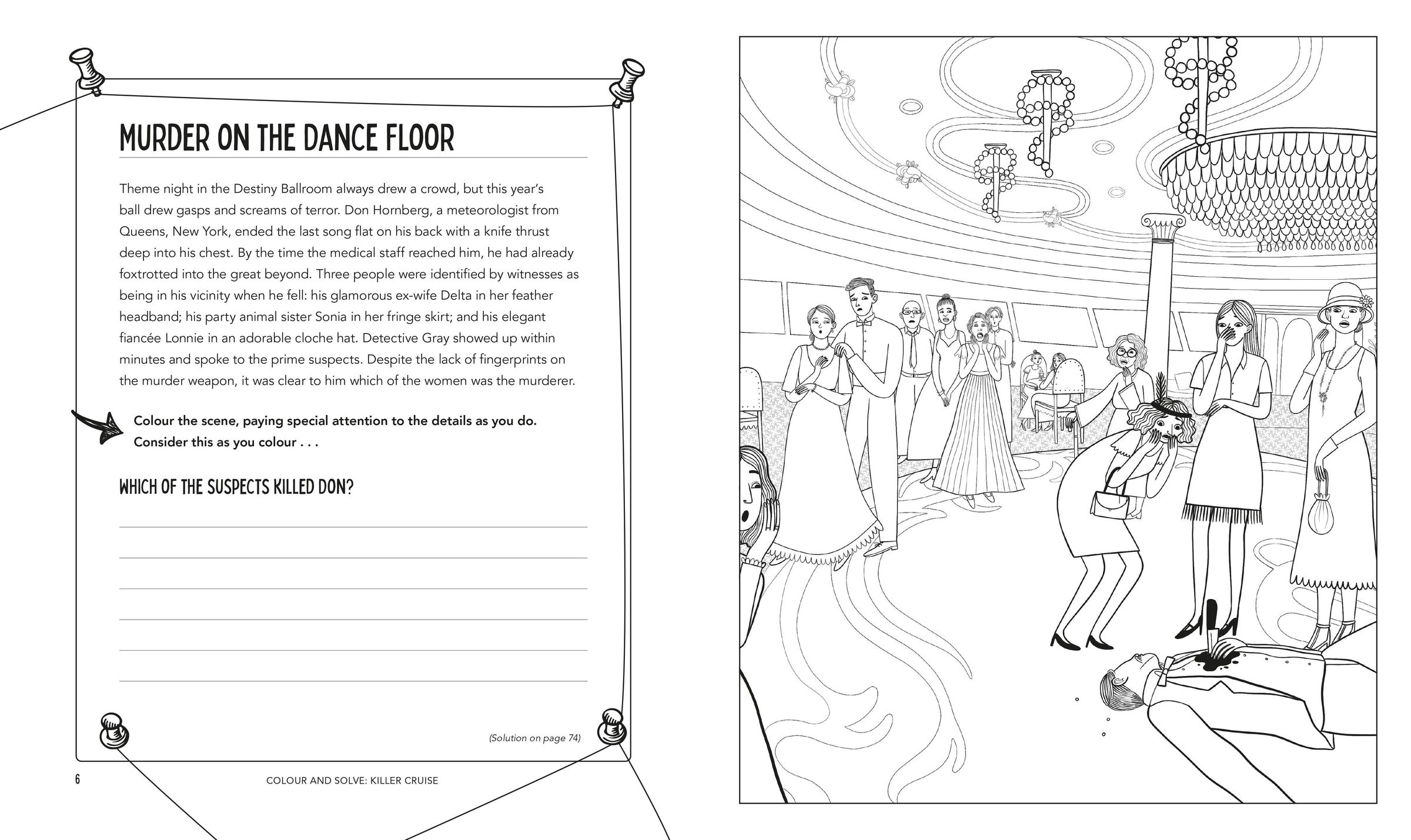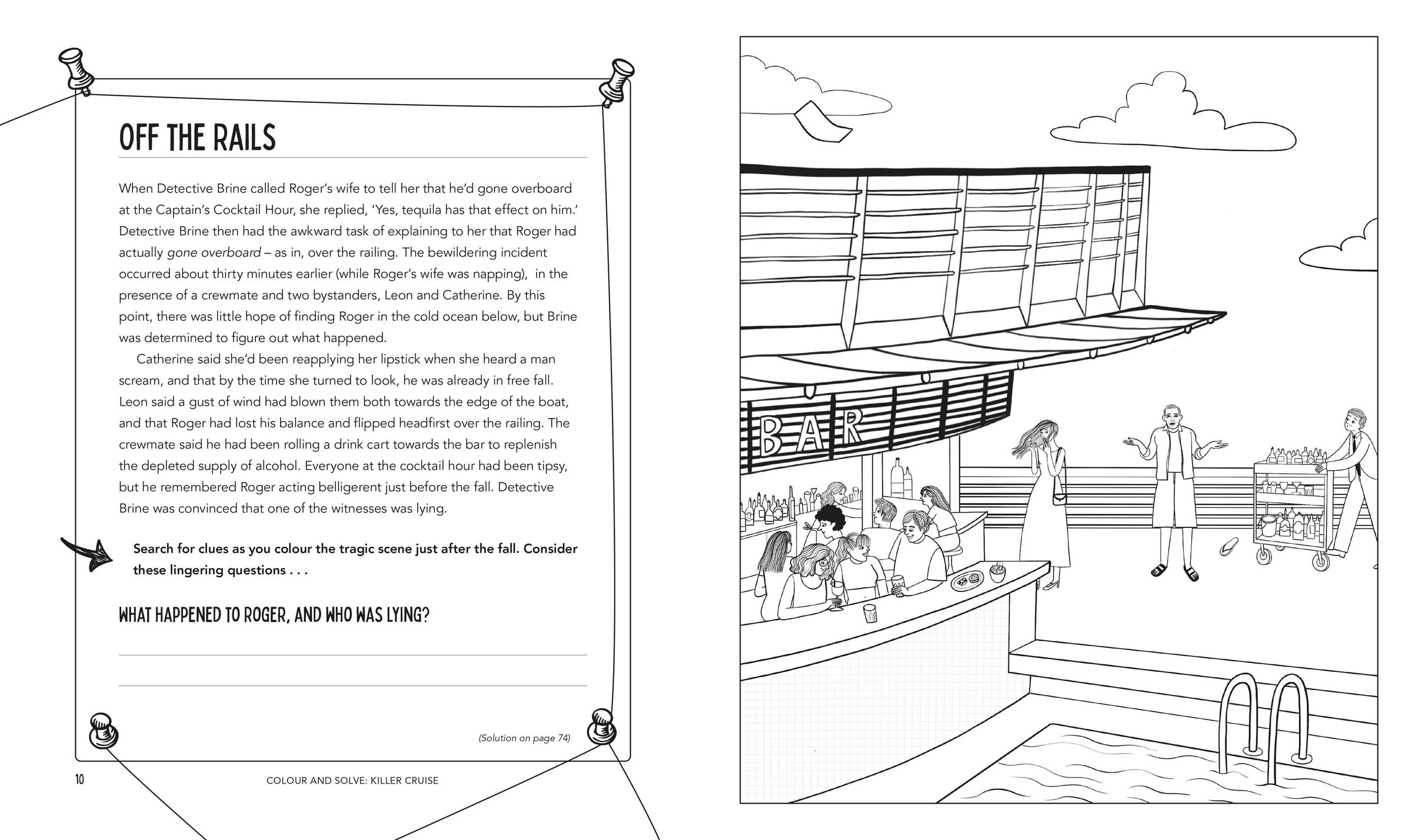 Test your detective skills with this wonderfully immersive colouring book. Each page offers a brand-new story of murder and mayhem along with a colour-in crime scene full of clues. From poolside poisonings, to murder on the main deck, no one expected such a choppy ride when they set sail. It's up to you to solve the crime: read the case file, colour the crime scene, dodge the red herrings, and catch the villain . . . if you can.