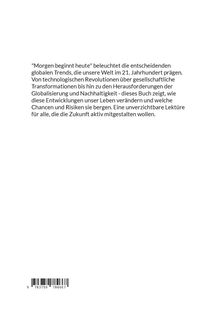 "Morgen beginnt heute" beleuchtet die entscheidenden globalen Trends, die unsere Welt im 21. Jahrhundert prägen. Von technologischen Revolutionen über gesellschaftliche Transformationen bis hin zu den Herausforderungen der Globalisierung und Nachhaltigkeit - dieses Buch zeigt, wie diese Entwicklungen unser Leben verändern und welche Chancen und Risiken sie bergen. Eine unverzichtbare Lektüre für alle, die die Zukunft aktiv mitgestalten wollen.