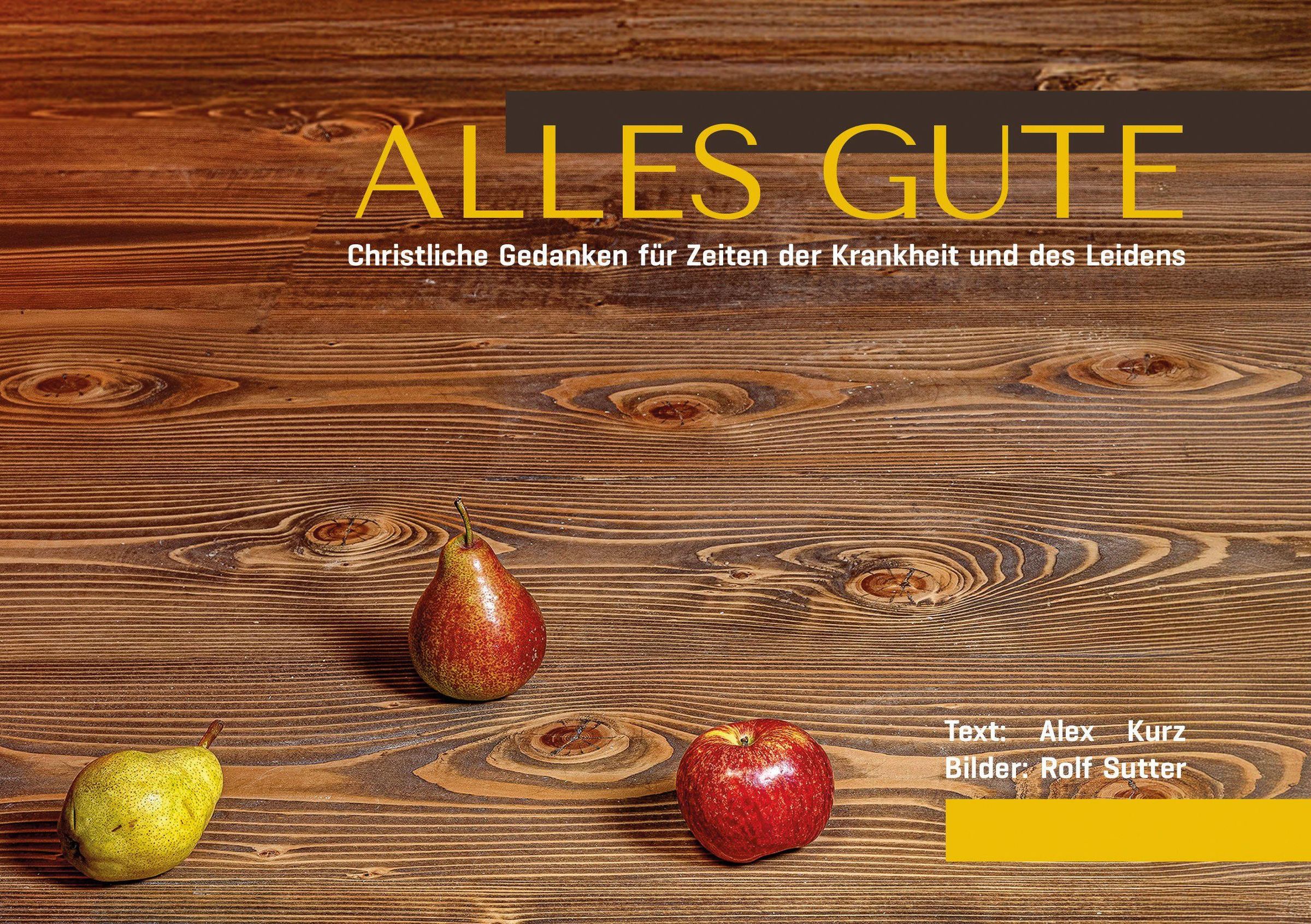 „ALLES GUTE“ in Gelb, darunter: „Christliche Gedanken für Zeiten der Krankheit und des Leidens“. Holz, zwei Birnen, ein Apfel., Buch