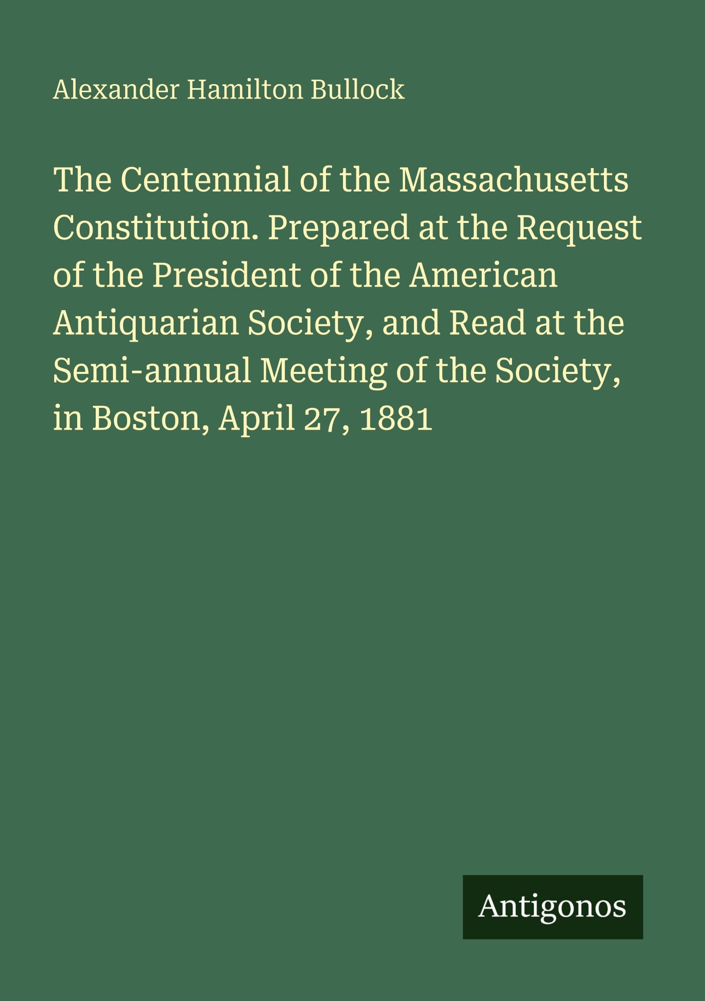 The Centennial of the Massachusetts Constitution. Prepared at the Request of the President of the American Antiquarian Society, and Read at the Semi-annual Meeting of the Society, in Boston, April 27, 1881