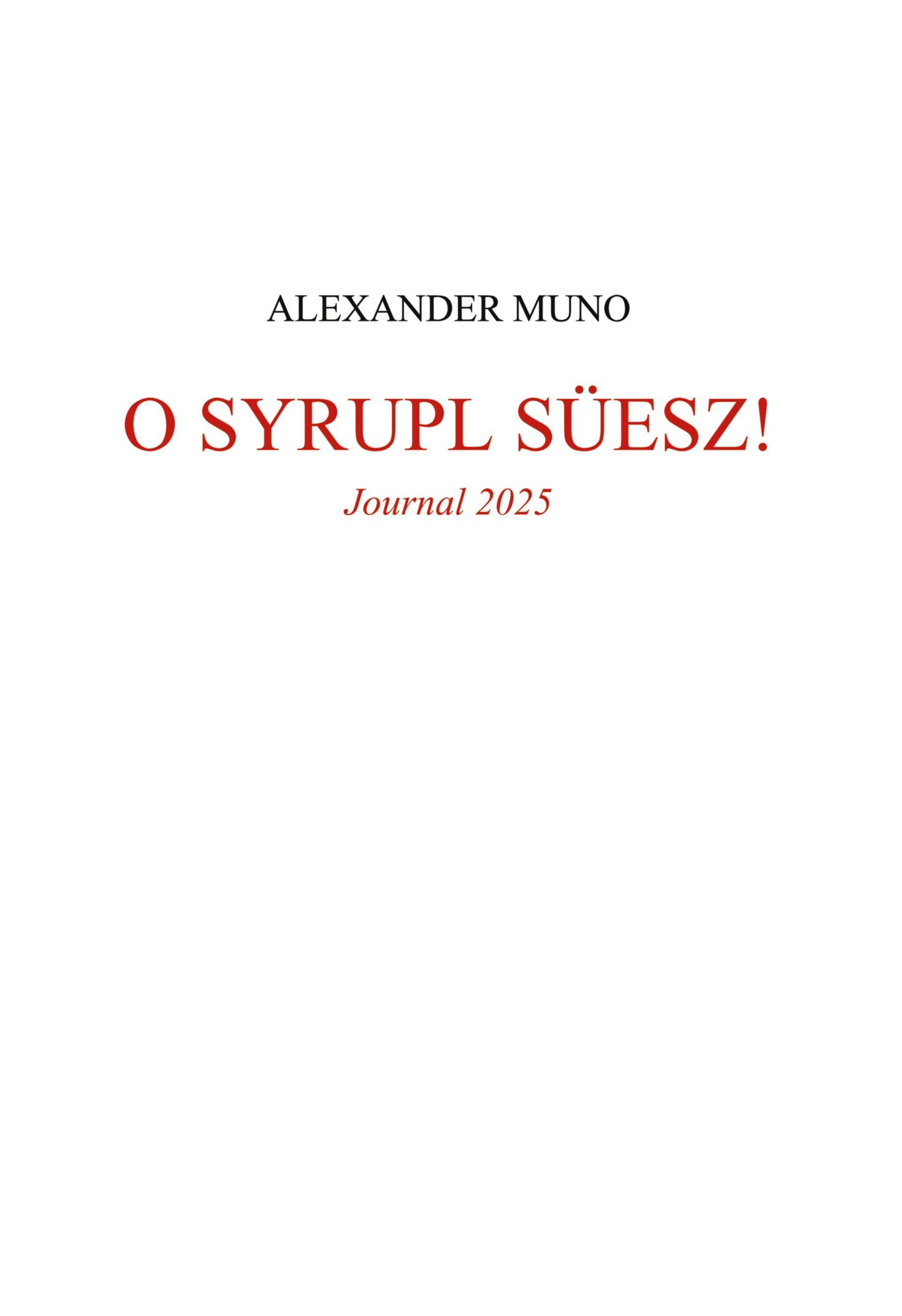ALEXANDER MUNO, O SYRUPL SÜESZ!, Journal 2025. Text zentral in schwarz und rot auf weißem Hintergrund., Buch