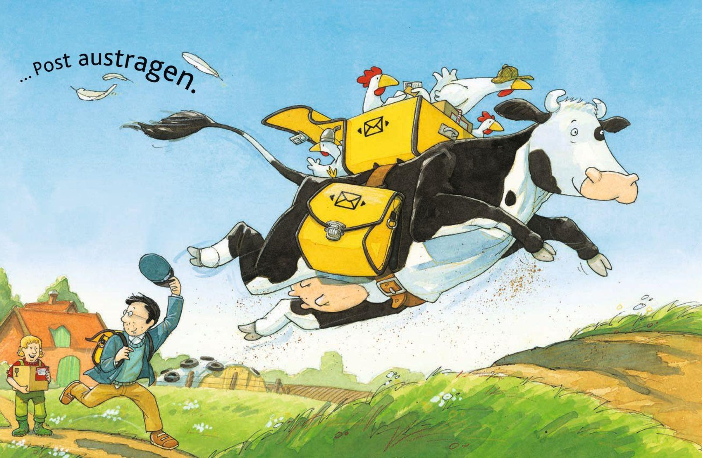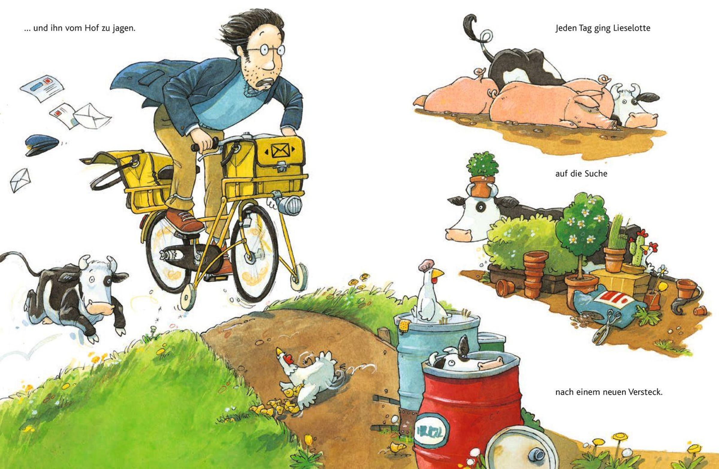 Die Kuh Lieselotte ist eigentlich ganz friedlich. Nur auf den Postboten hat sie es irgendwie abgesehen ... Nichts liebt sie mehr, als ihm aufzulauern und ihn zu erschrecken. Der arme Kerl hat schon Albträume. Auch die Bäuerin ist wütend. Denn jedes Paket, das sie bekommt, ist beschädigt, weil der Postbote es vor lauter Schreck immer fallen lässt. So geht das nicht weiter. Da hat der Postbote eine Idee ...