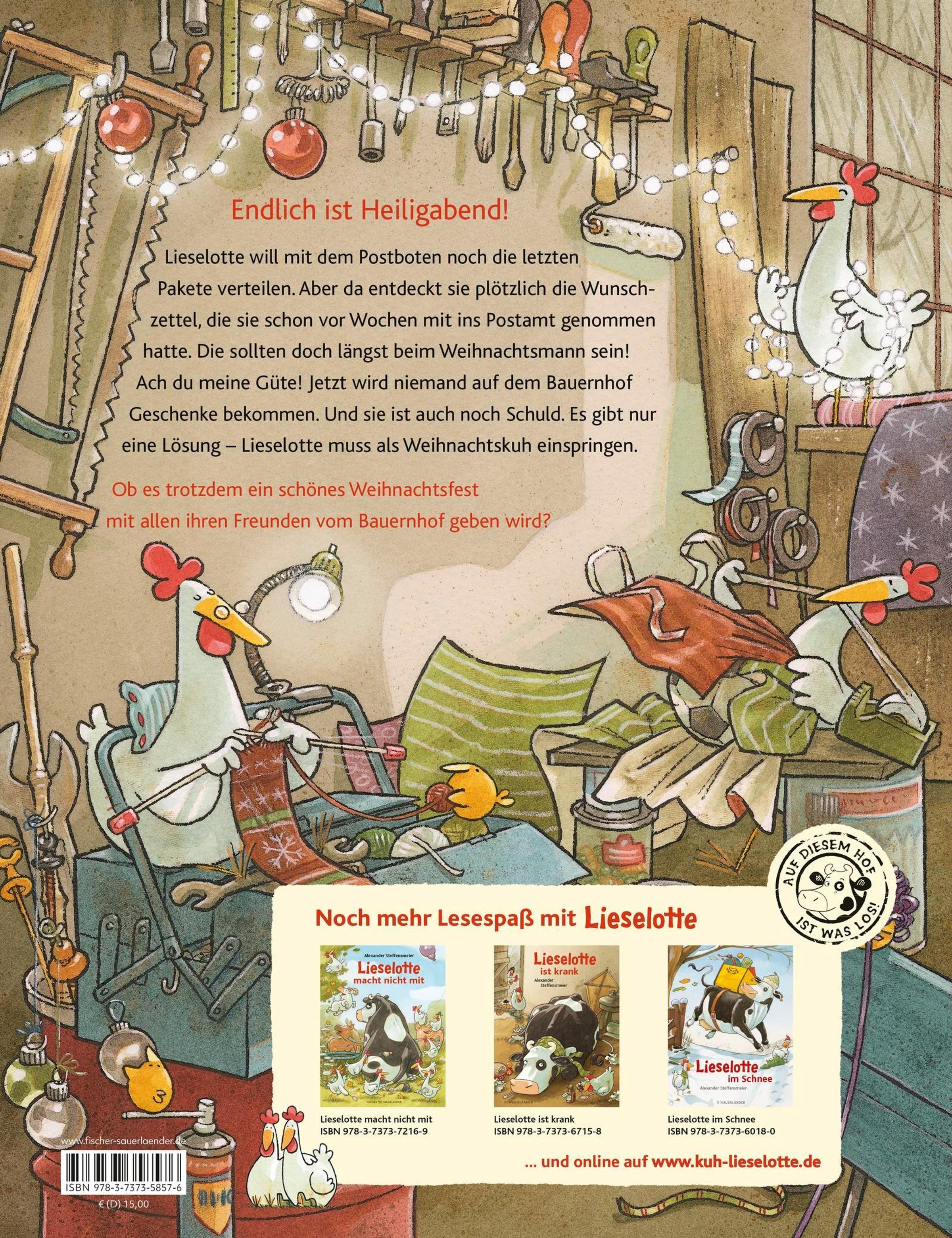 Lieselotte will mit dem Postboten noch die letzten Pakete verteilen, und dann steht der Weihnachtsfeier auf dem Hof nichts mehr im Weg. Aber da entdeckt sie plötzlich die Wunschzettel, die sie schon vor Wochen mit ins Postamt genommen hatte. Die sollten doch längst beim Weihnachtsmann sein! Ach du meine Güte! Jetzt wird niemand auf dem Bauernhof Geschenke bekommen. Und sie ist auch noch Schuld. Es gibt nur eine Lösung - Lieselotte muss als Weihnachtskuh einspringen. Das kann ja so schwer nicht sein: Sie muss nur herausfinden, was sich die anderen wünschen, und die Geschenke dann schnell noch selber basteln. Nur leider ist Lieselotte doch nicht ganz so geschickt, wie sie dachte, und die Basteleien gehen gründlich daneben. Was war das bloß für ein Weihnachten. Kein Schnee, keine Geschenke? Das hat sie sich ganz anders vorgestellt. Aber auf Lieselottes Freunde ist Verlass und so feiern sie alle zusammen ein fröhliches und gemütliches Weihnachtsfest.