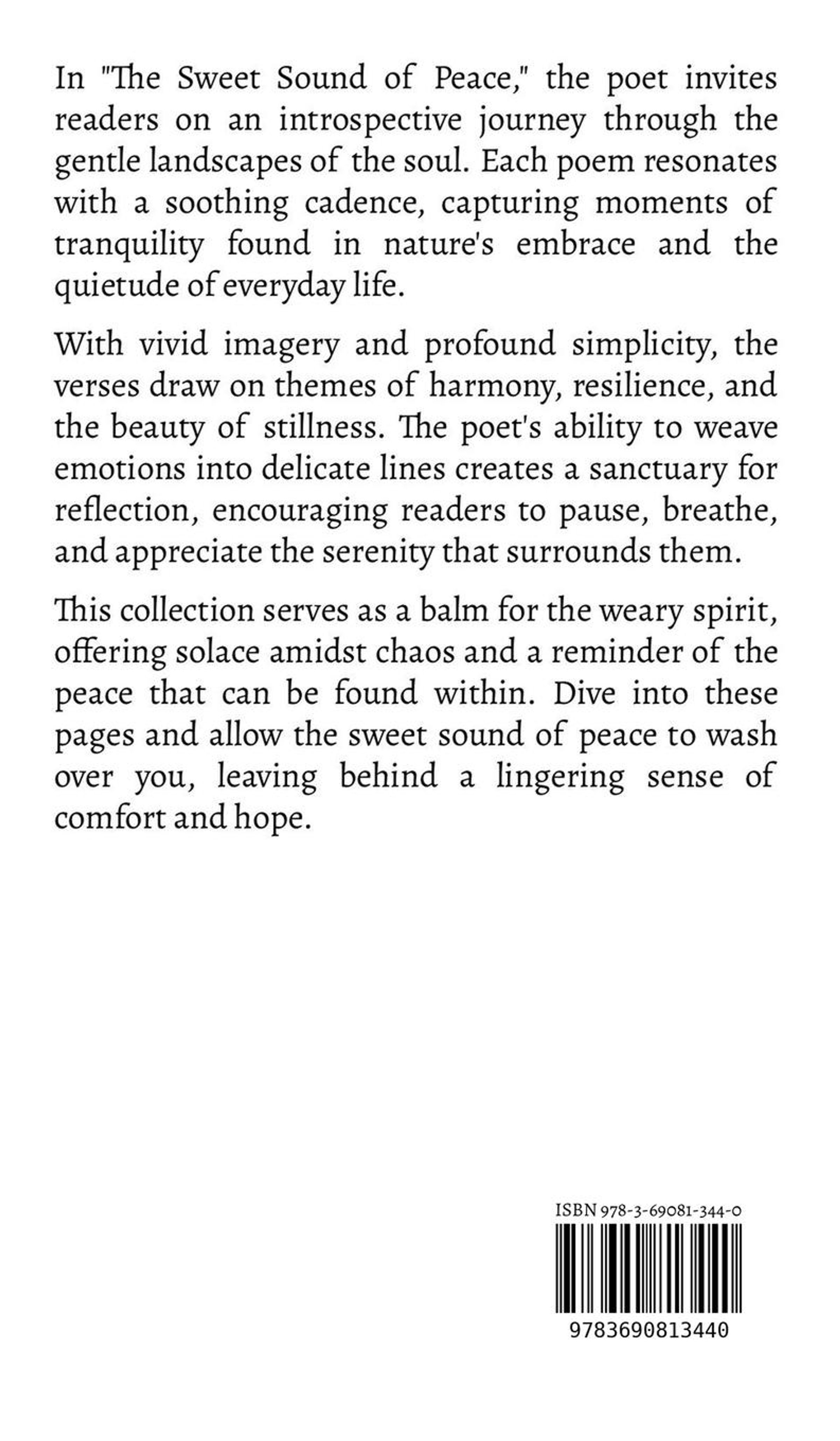 In "The Sweet Sound of Peace," the poet invites readers on an introspective journey through the gentle landscapes of the soul. Each poem resonates with a soothing cadence, capturing moments of tranquility found in nature's embrace and the quietude of everyday life. With vivid imagery and profound simplicity, the verses draw on themes of harmony, resilience, and the beauty of stillness. The poet's ability to weave emotions into delicate lines creates a sanctuary for reflection, encouraging readers to pause, breathe, and appreciate the serenity that surrounds them. This collection serves as a balm for the weary spirit, offering solace amidst chaos and a reminder of the peace that can be found within. Dive into these pages and allow the sweet sound of peace to wash over you, leaving behind a lingering sense of comfort and hope.